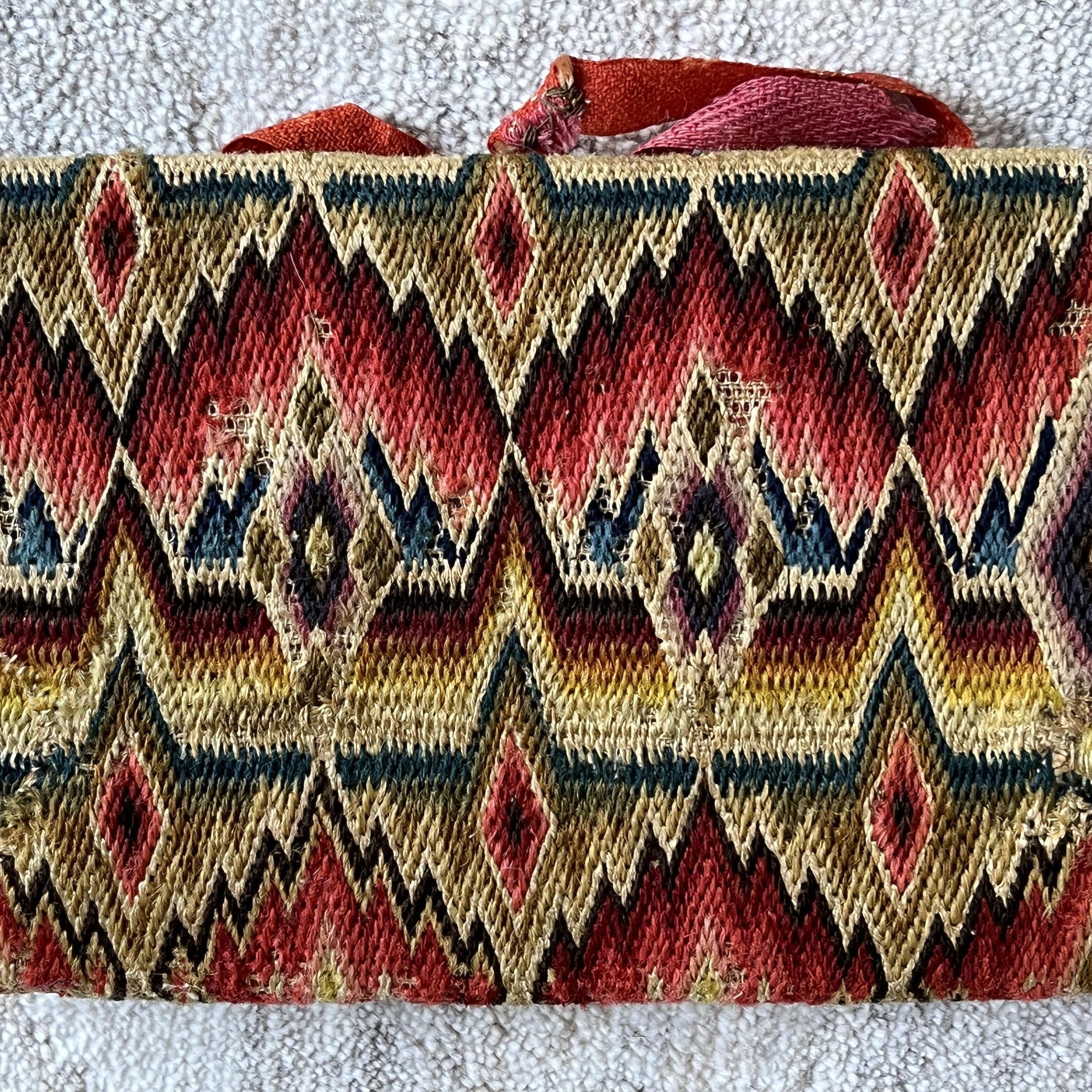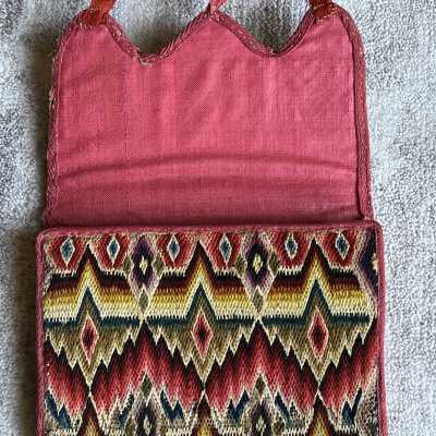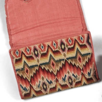 The envelope-shaped trifold pocketbook with flame stitch embroidery and a wavy top flap edged with red twill tape sewn around all edges. The twill tape also has extensions that would have served to secure the closure. The interior is lined with dark pink salmon silk and contains two compartments with side gussets.