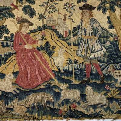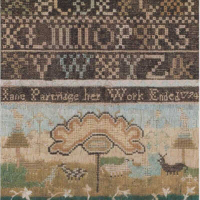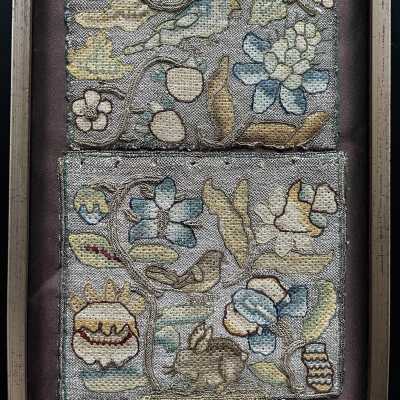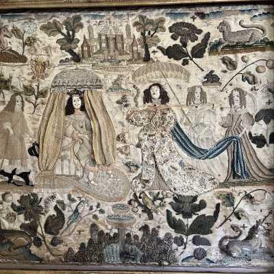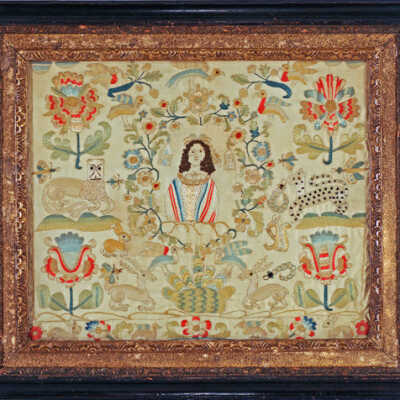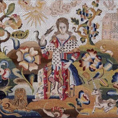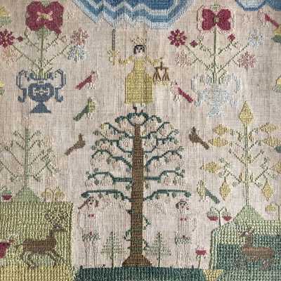 Silk Embroidery Sampler, Female Figure, Flowers, Animals, c.1670