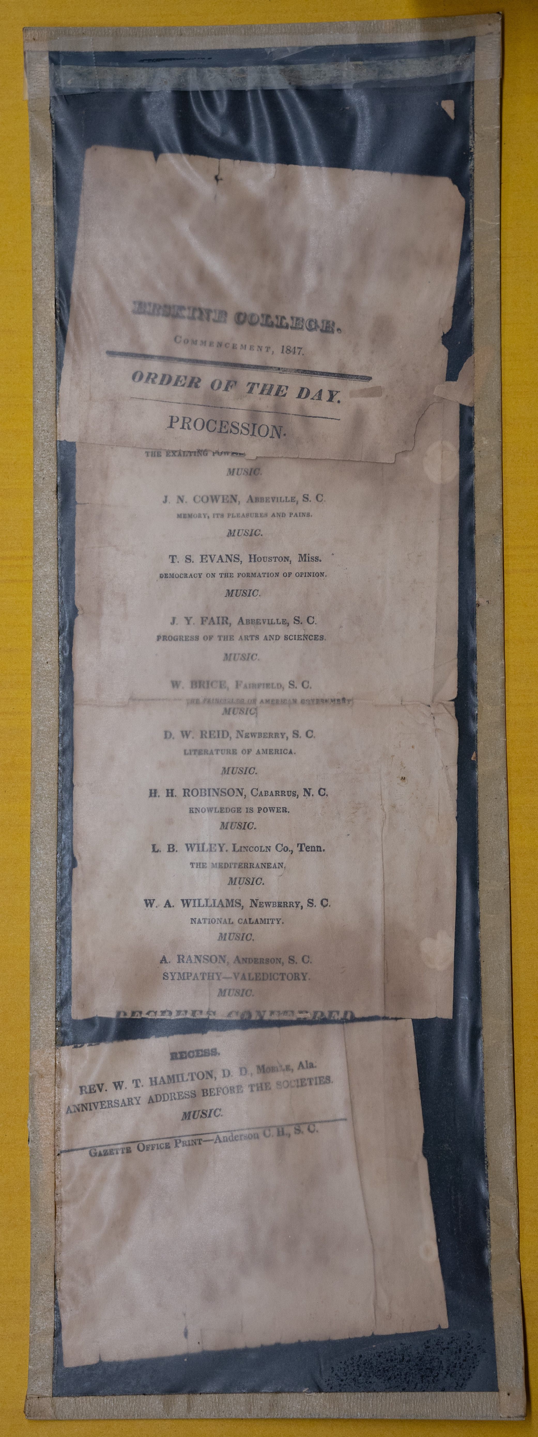 A very early example of Erskine's order of commencement, dated 1847, just eight years after Erskine became a four-year college and 10 year's after the initial charter of "Clark and Erskine Seminary" in 1837.Category