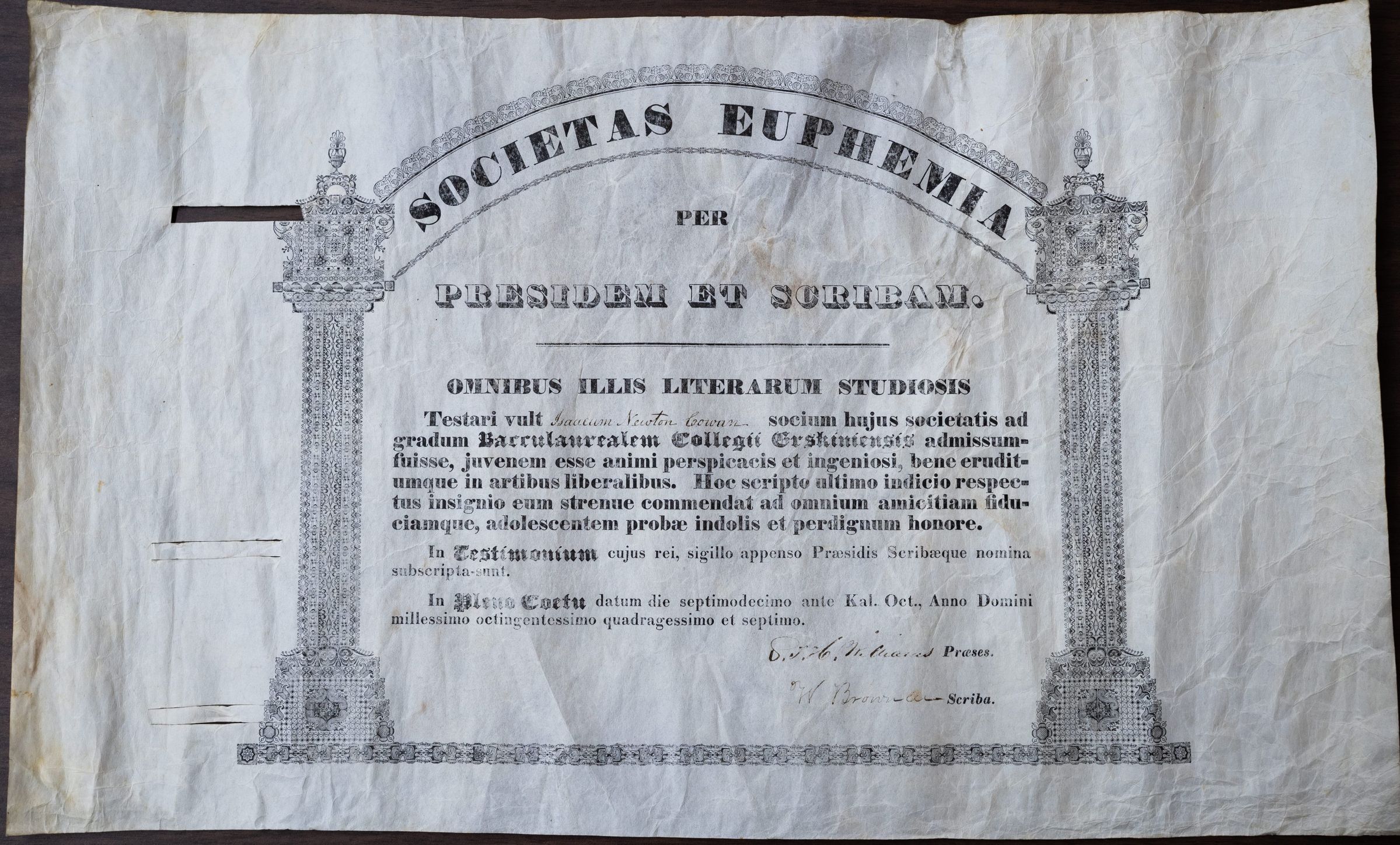 This diploma was awarded to an Erskine graduate by the Euphemian Literary Society in 1847.