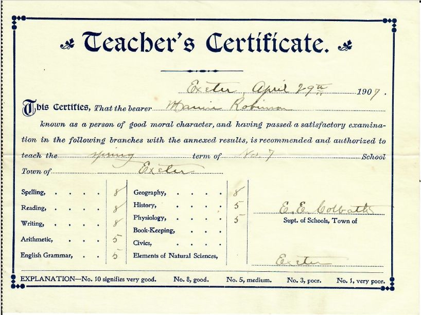 Mamie Robinson's teaching certificate from April 1907 for the spring term of School No. 7