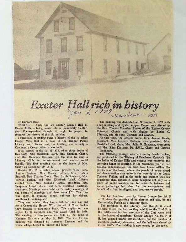 "Exeter Hall rich in history" Newspaper article written by Stewart Bean. Published January 4, 1979.Subject