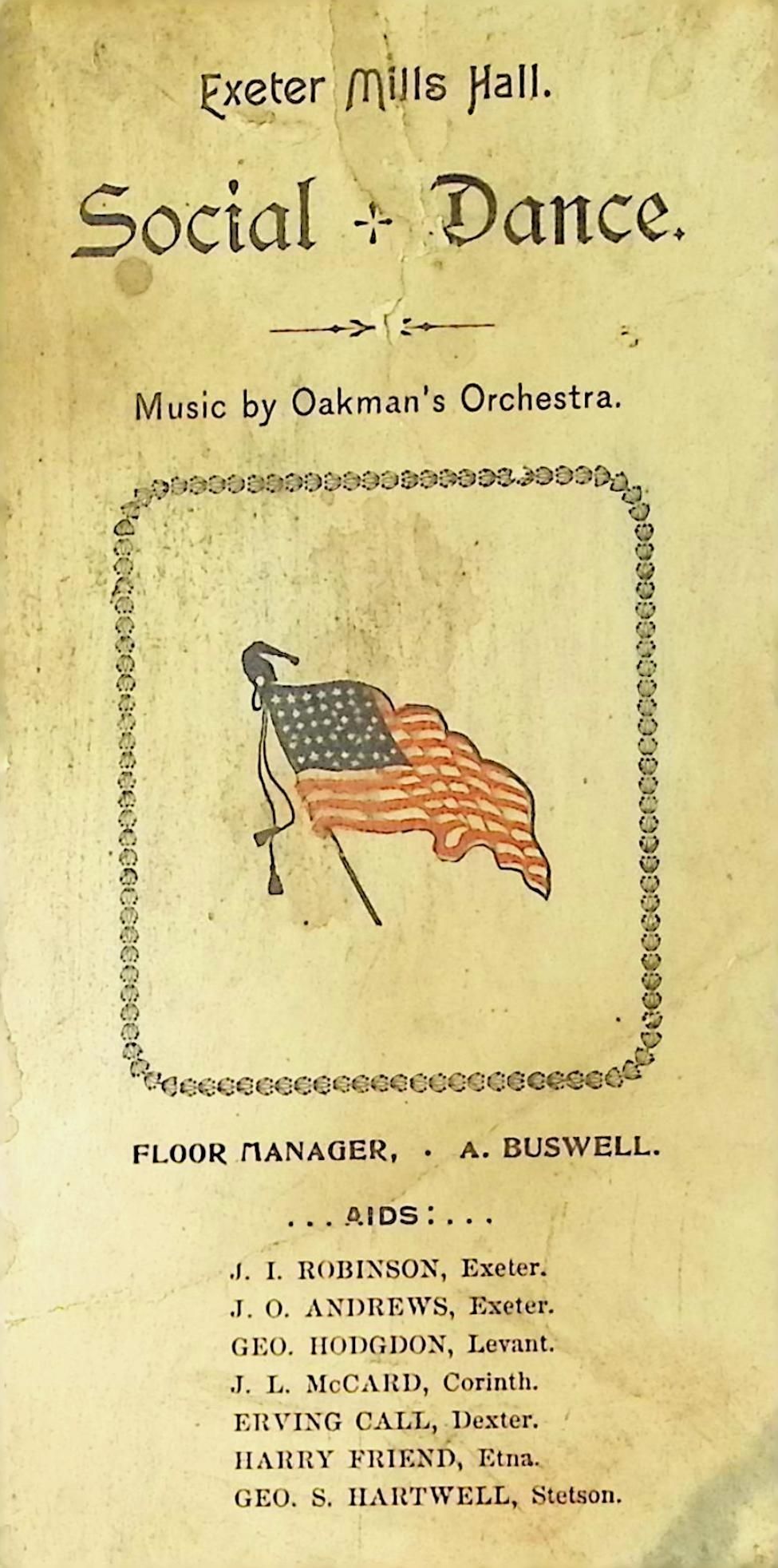 Exeter Mills Hall Social Dance Program with order of dances. Music by Oakman's Orchestra.Subject Place