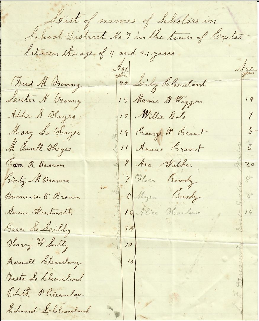 School No. 7 census of scholars between age 4 and 21, August 1884: Fred Young, Lester Young, Addie Hayes, Mary Hayes, Ewell Hayes, Eva Brown, Girty Brown, ? Brown, Annie Wentworth, Grace Libby, Harry Libby, Roswell Cleaveland, Vesta Cleaveland, Edith Cleaveland, Edward Cleaveland, Lily Cleaveland, Marrie Wiggen, Willie Cole, George Grant, Annie Grant, Ava Walker, Flora Gowdy, Myra Gowdy, Alice Harlow