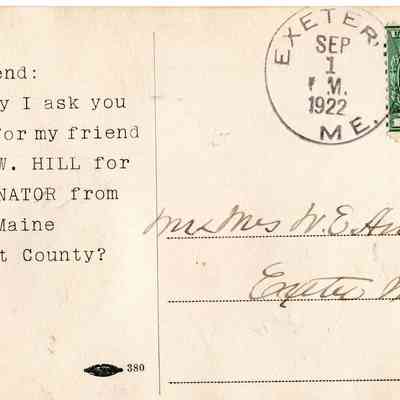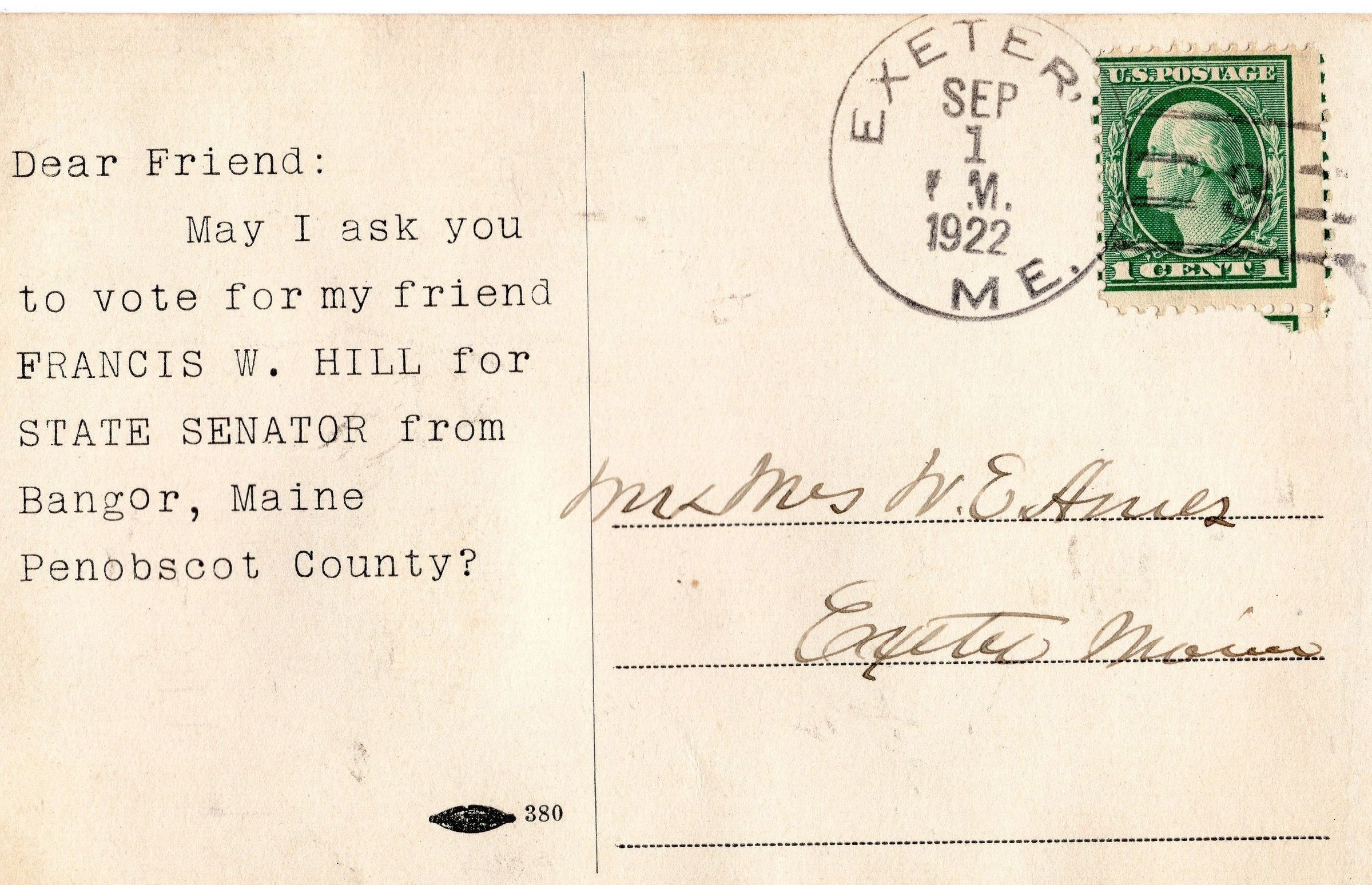 Francis W. Hill's State Senate Political Postcard. Sent to Willis Ames in 1922.