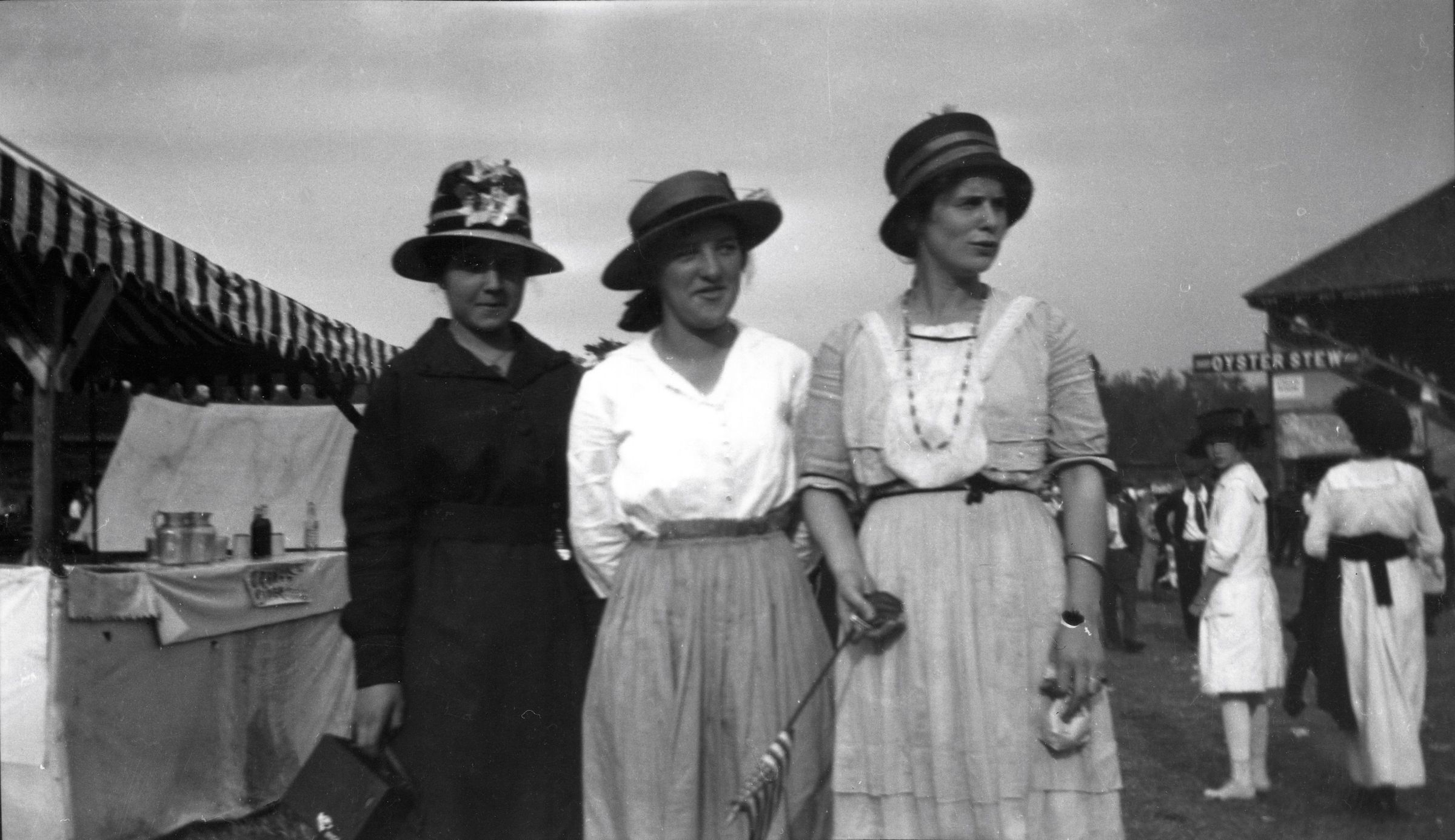 Women standing in the midway of the Exeter Fair. Year unkown.Photograph Details