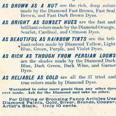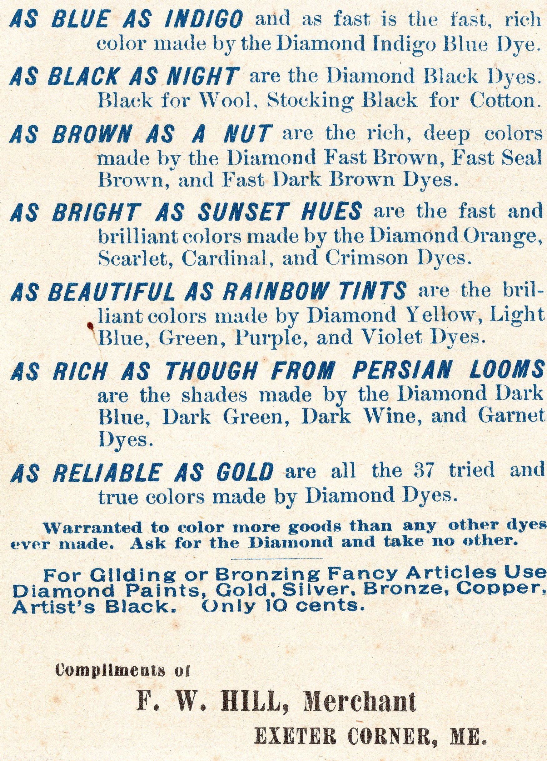 Diamond Dyes Advertising Card - Product carried by F. W. Hill, Exeter Corner.