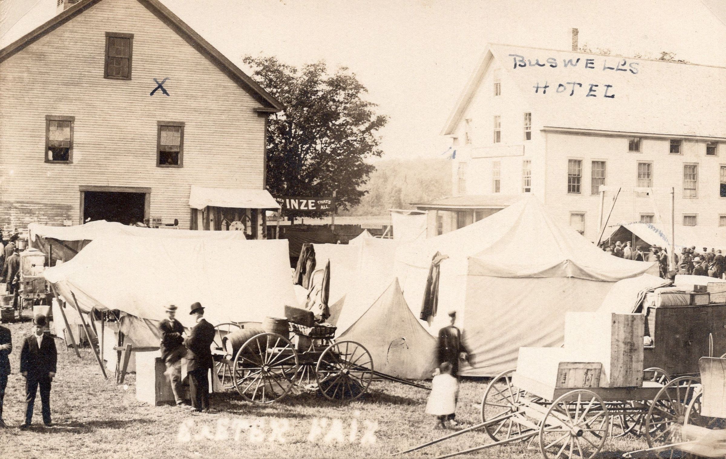 Exeter Fair venders and buildings on site of fairgrounds. White building is possibly a hotel owned by Charles R. Buswell.