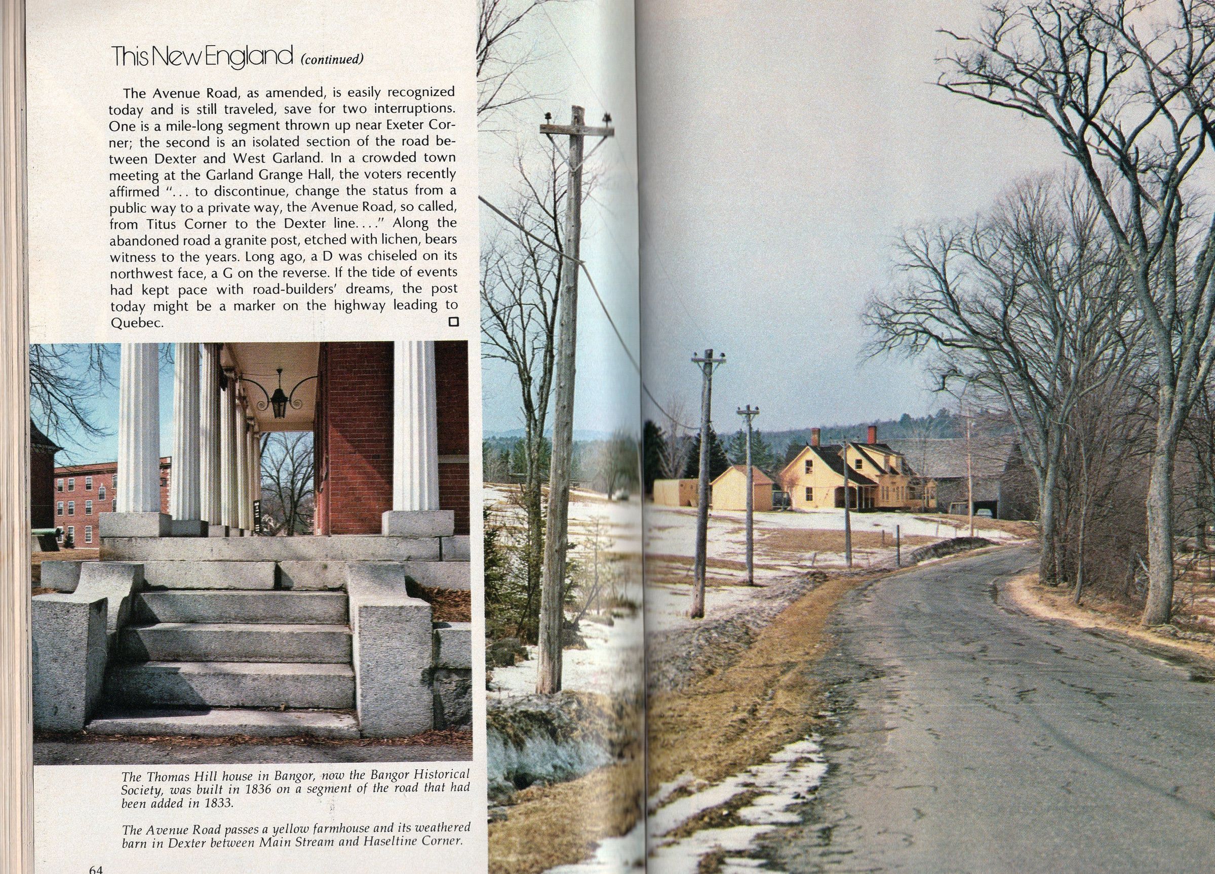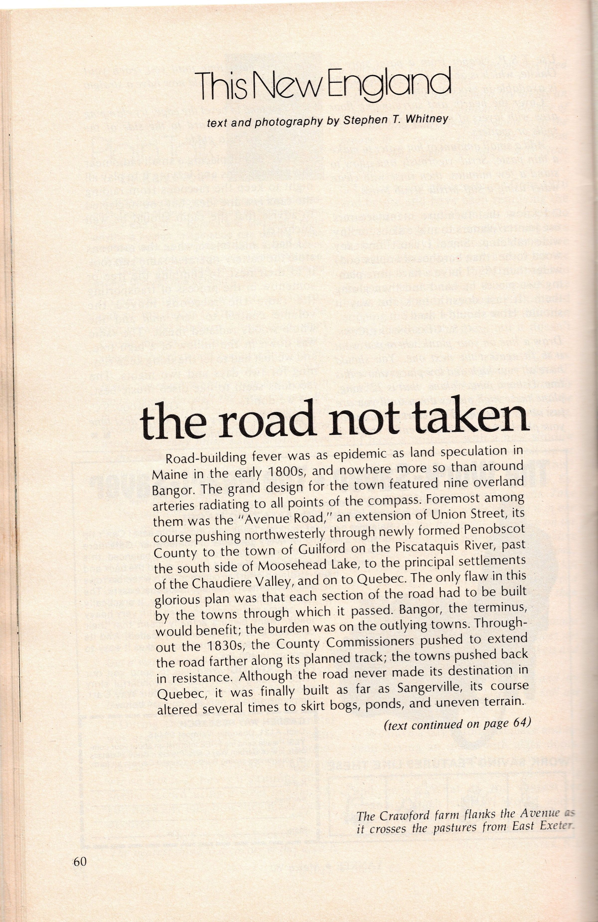 "The Road Not Taken" written by Stephen T. Whitney and published in the March 1980 edition of Yankee Magazine. Article is about the Avenue Road.