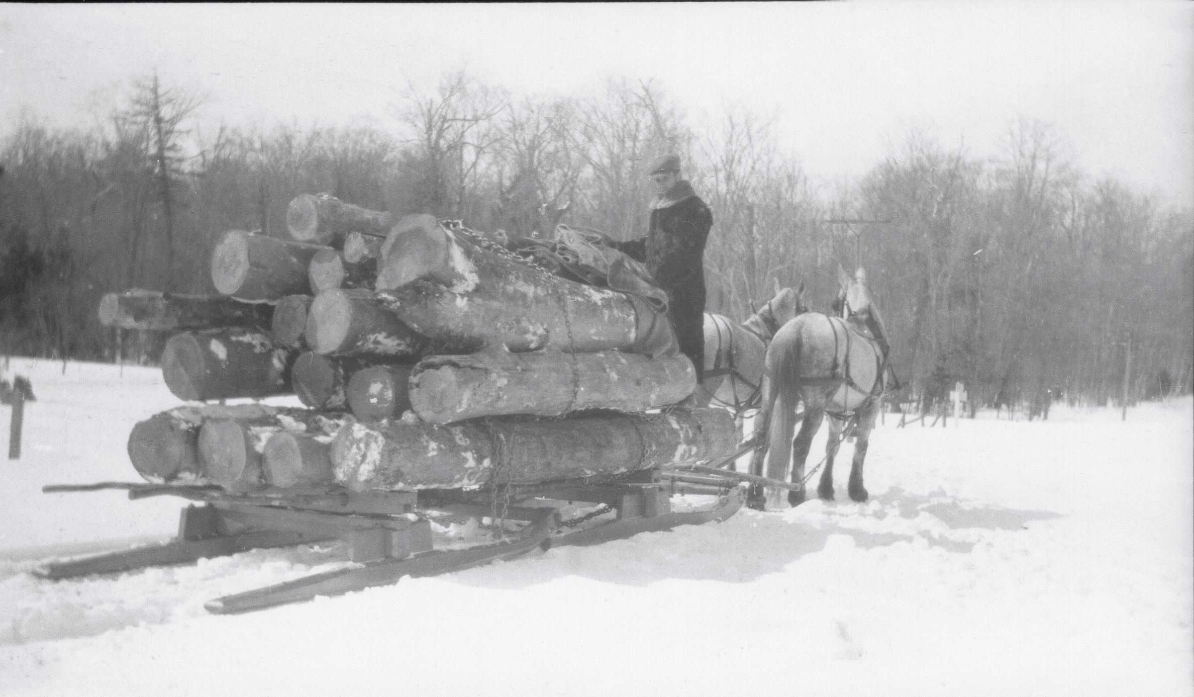 Winter scene with horses hitched to sled with logs. From the Fred Ames photo collection. Year unknown.