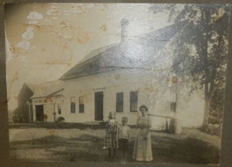 Picture of the Leathers farmhouse and barn with a woman and two children, East ExeterPhotograph Details
