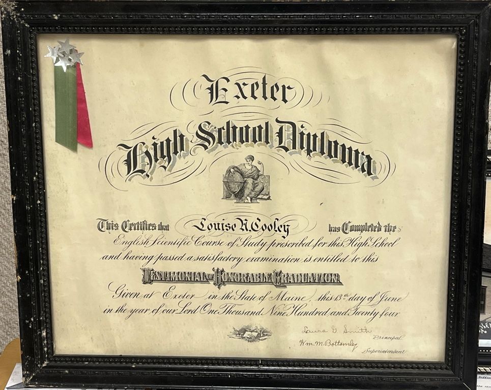 This Certifies that Louise A. Cooley has Completed the English Scientific Course of Study prescribed for this High Schoo and having passed a satisfactory examination is entitled to this TESTIMONIAL OF HONORABLE GRADUATION Given at Exeter in the State of Maine, this 13th day of June in the year of our Lord One Thousand Nine Hundred and Twenty four. Signed Laura G. Smith (Principal) and Wm. M. Bottomley (Superintendent).