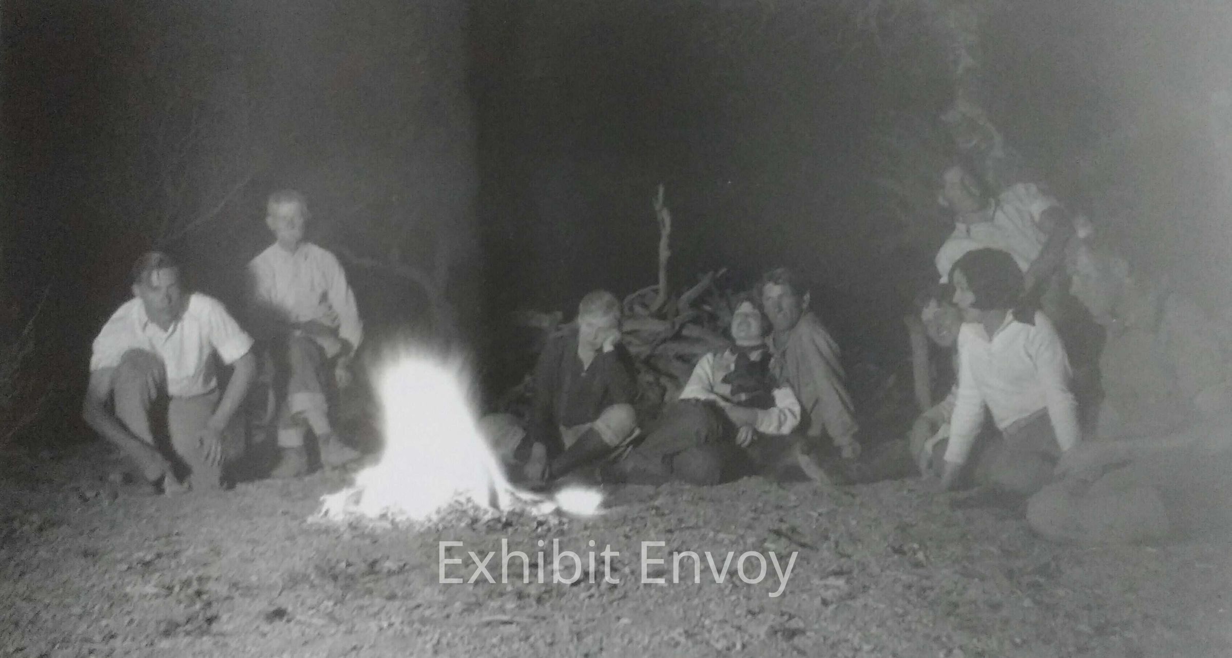 Around the campfire at the C Ranch, 1930. The names listed are: "Gray, Mr. Broadstreet, Aunt Claire, Leona, Nelson, Lloyd, Miss Kaiser, me (Lula) and Fay."