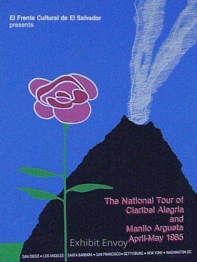 Clearly inspired by Cuban poster styles in its simple form, loose textures, and bold colors, this poster features the socialist rose and a volcano representing the underlying power of rebels based in the mountains of El Salvador. It embodies the best qualities of a political poster in its visual expression of abstract principles, taking on big ideas – like freedom from an oppressive regime – and making them concrete.