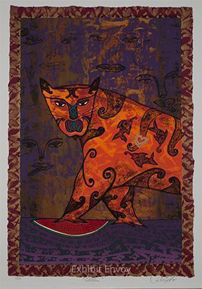 In Robles’ telling, he learned to draw the jaguar when René Castro saw him struggling and suggested he look at books; Robles insisted he could draw one from memory. This process of probing his internal visions led Robles to derive his own symbolic language. The rich color and texture in this print also reflect the spontaneous approach that Robles developed by watching Castro print.