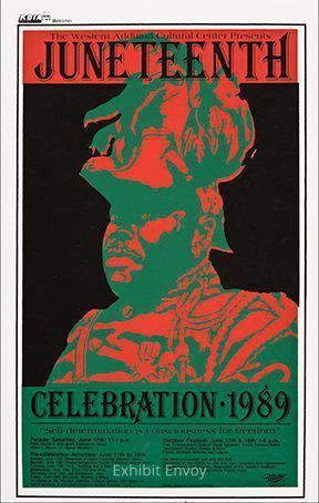 First celebrated on June 19, 1865, in Galveston, Texas, Juneteenth marks the emancipation of slaves after the Civil War. Because of its Texan roots, recognition of Juneteenth often incorporates western themes, such as the cowboy-style font here. Pinkney also portrays Marcus Garvey, a Jamaican-born advocate of Pan Africanism, using the colors of his United Negro Improvement Association: red, black, and green, the symbolic colors of Black African liberation since 1920.