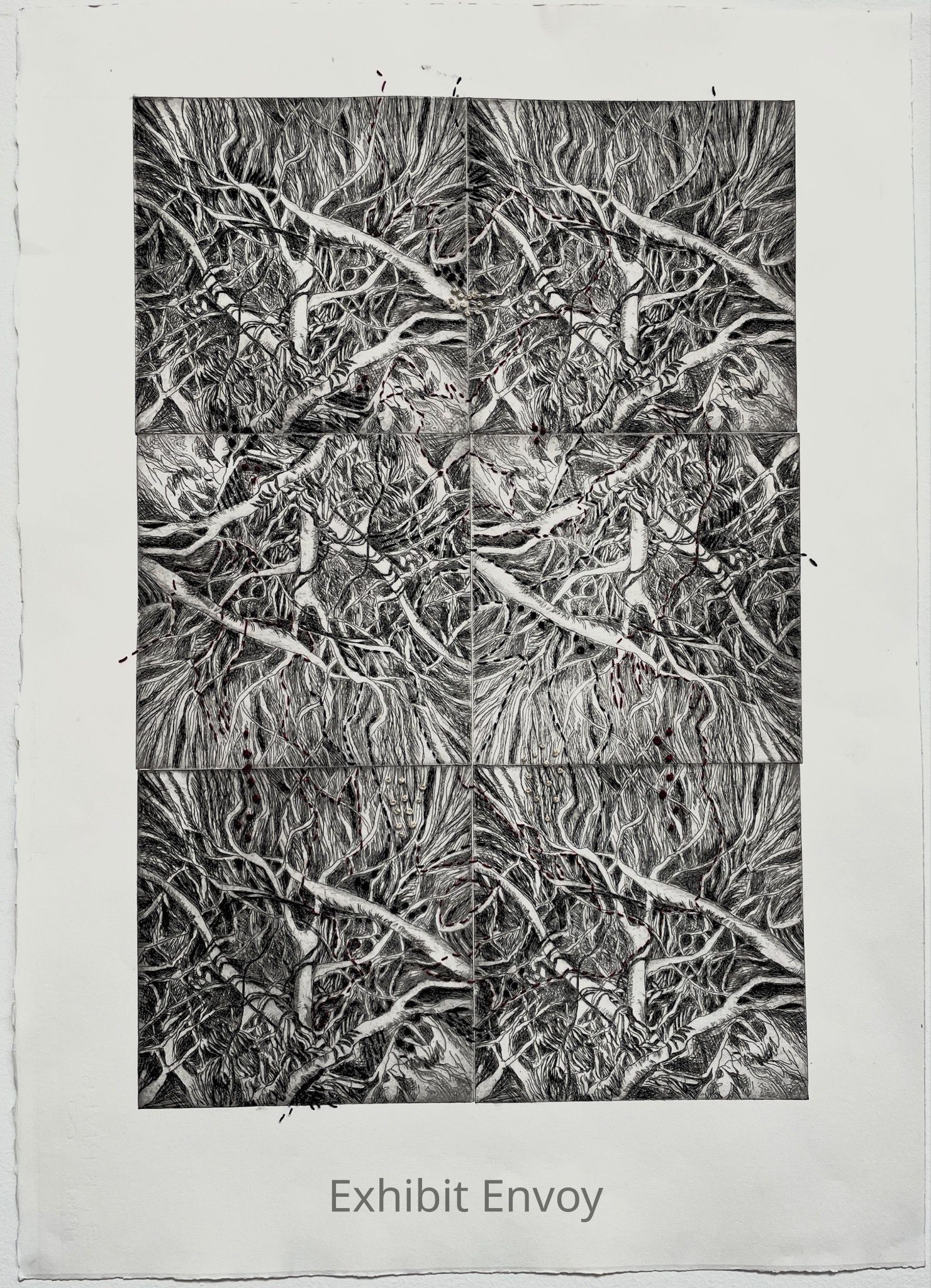Oil based etching ink printed on BFK with red, ecru, and black thread.