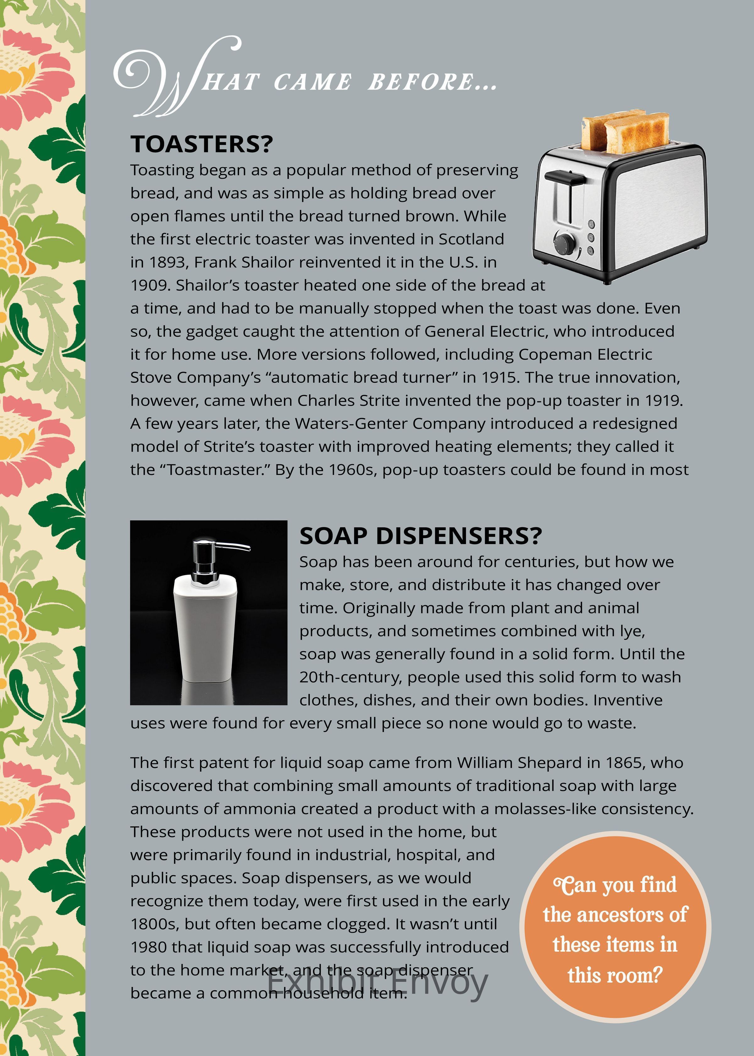 Kitchen. Scavenger Hunt: ancestors of the toaster and soap dispenser.