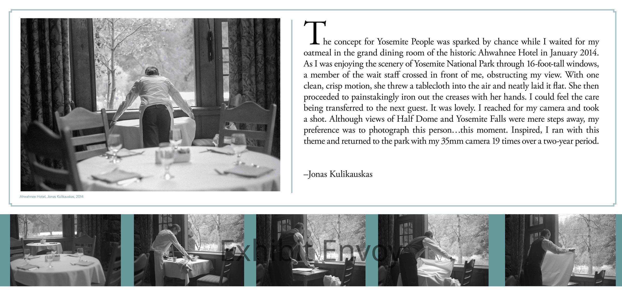 The concept for Yosemite People was sparked by chance while I waited for my oatmeal in the grand dining room of the historic Ahwahnee Hotel in January 2014. As I was enjoying the scenery of Yosemite National Park through 16-foot-tall windows, a member of the wait staff crossed in front of me, obstructing my view. With one clean, crisp motion, she threw a tablecloth into the air and neatly laid it flat. She then proceeded to painstakingly iron out the creases with her hands. I could feel the care being transferred to the next guest. It was lovely. I reached for my camera and took a shot. Although views of Half Dome and Yosemite Falls were mere steps away, my preference was to photograph this person…this moment. Inspired, I ran with this theme and returned to the park with my 35mm camera 19 times over a two-year period.