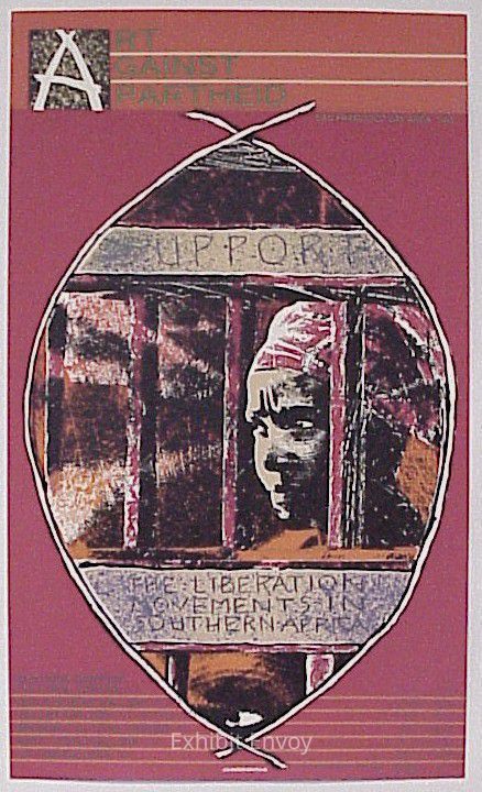 The success of traveling exhibit “Art Against U.S. Intervention in Central America” led several of the same organizers, including Peter Selz and Betty Kano, to develop another effort, “Art Against Apartheid.” Artists donated hundreds of pieces for the show, all expressing their opposition to apartheid. Mexican-American artist Enrique Chagoya designed the project’s logo.