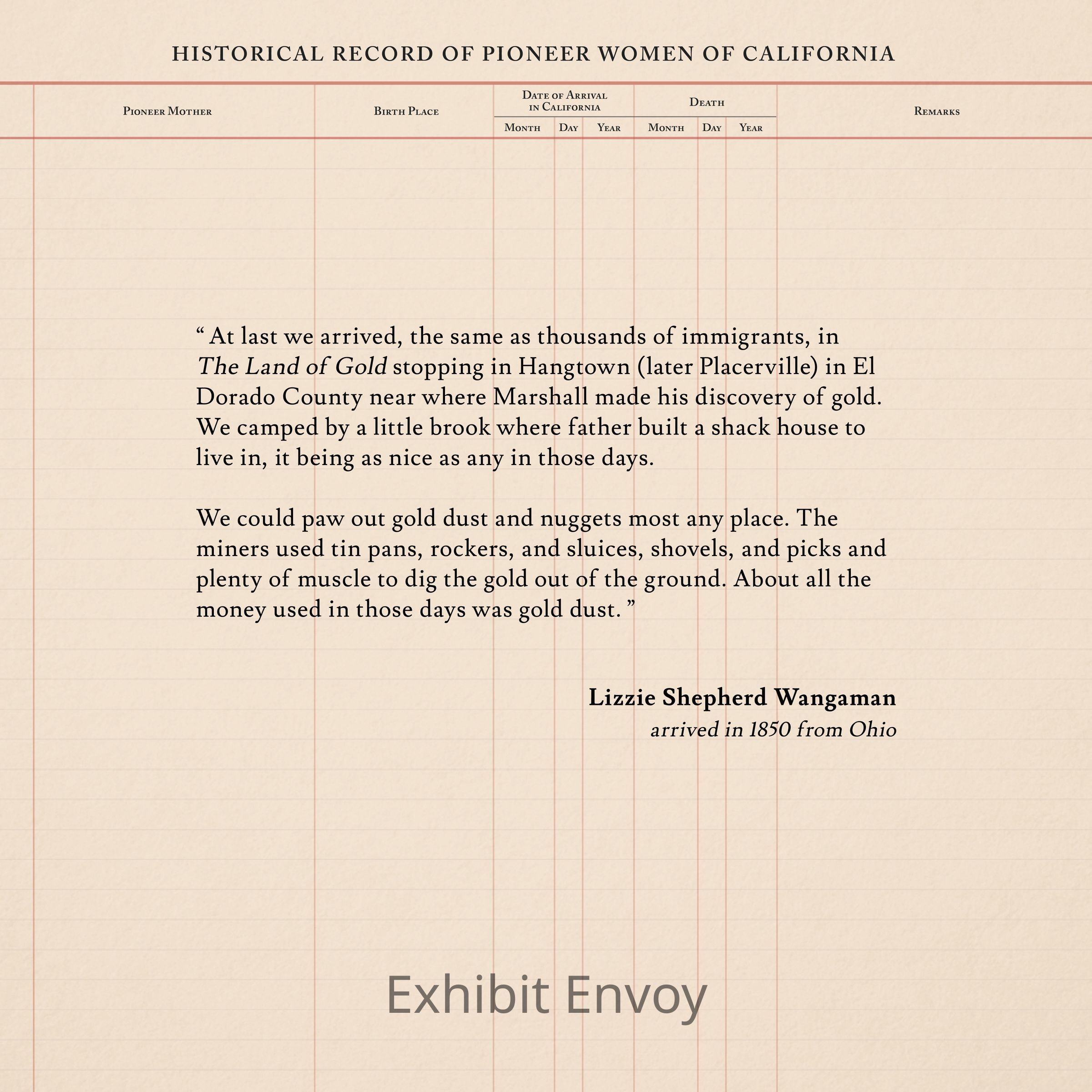 “ At last we arrived, the same as thousands of immigrants, in The Land of Gold stopping in Hangtown (later Placerville) in El Dorado County near where Marshall made his discovery of gold. We camped by a little brook where father built a shack house to live in, it being as nice as any in those days.
