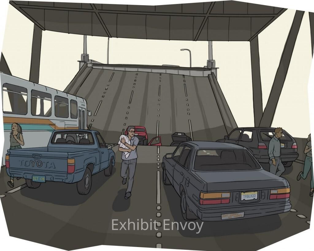 I was driving just east of Yerba Buena Island when I felt like I had like had a flat tire and heard a loud clank like running over a large piece of steel. The traffic was stopping, and still I was not aware of anything special until I saw people getting out to their cars. . . . We could see the piece of the upper deck, with the white lines, looking like a ramp to go to the upper deck about 50 yards in front of us.