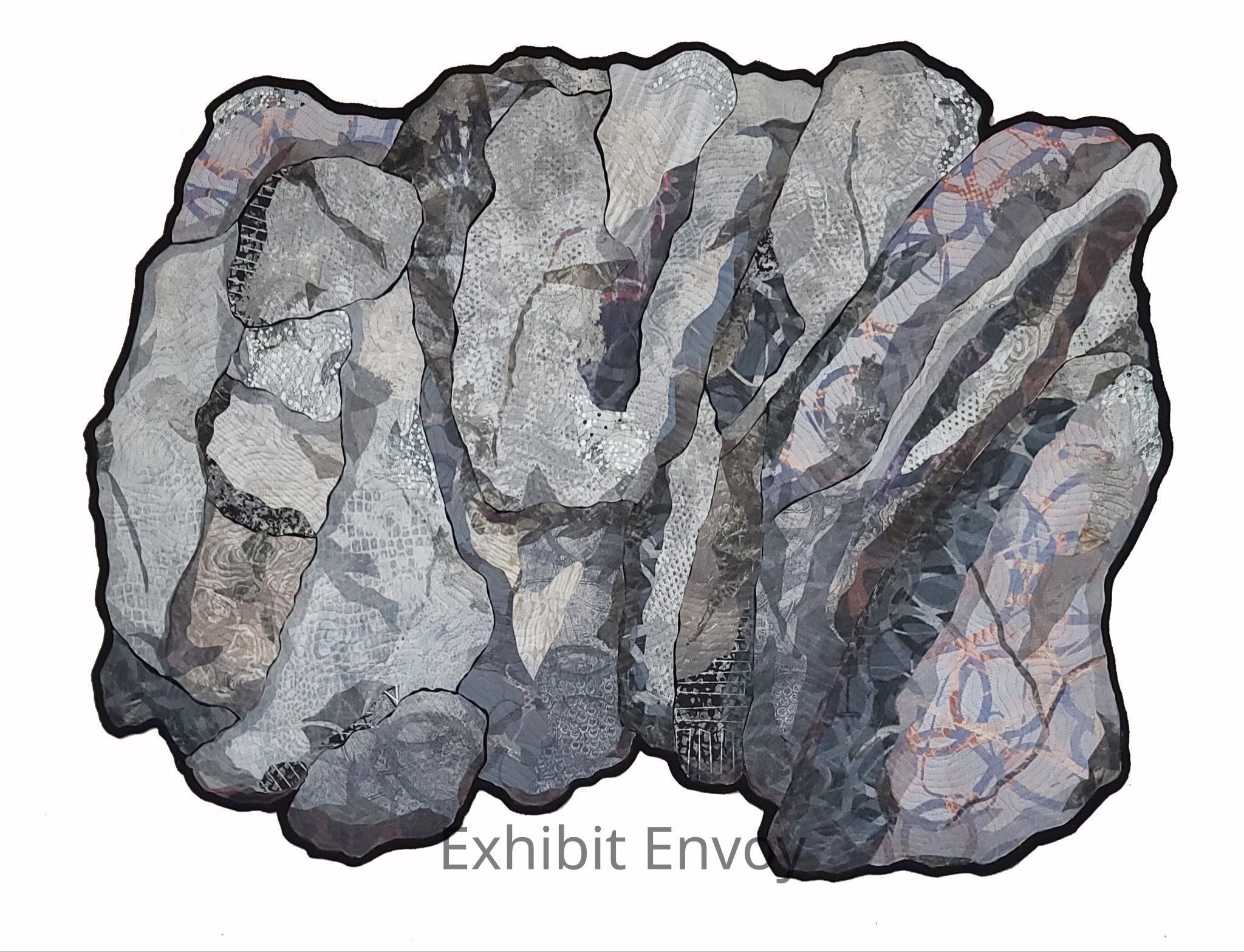 I am interested in the Natural world and wanted to interpret an interesting outcropping of granite rocks that I encountered on a hike in the Sierra Nevada Mountains. I used various printing processes to create a wide range of values and textures in gray fabrics. Each piece of fabric was monoprinted multiple times using my hand-cut stencil designs and/or was printed using thermofax screens of my design.Label Type