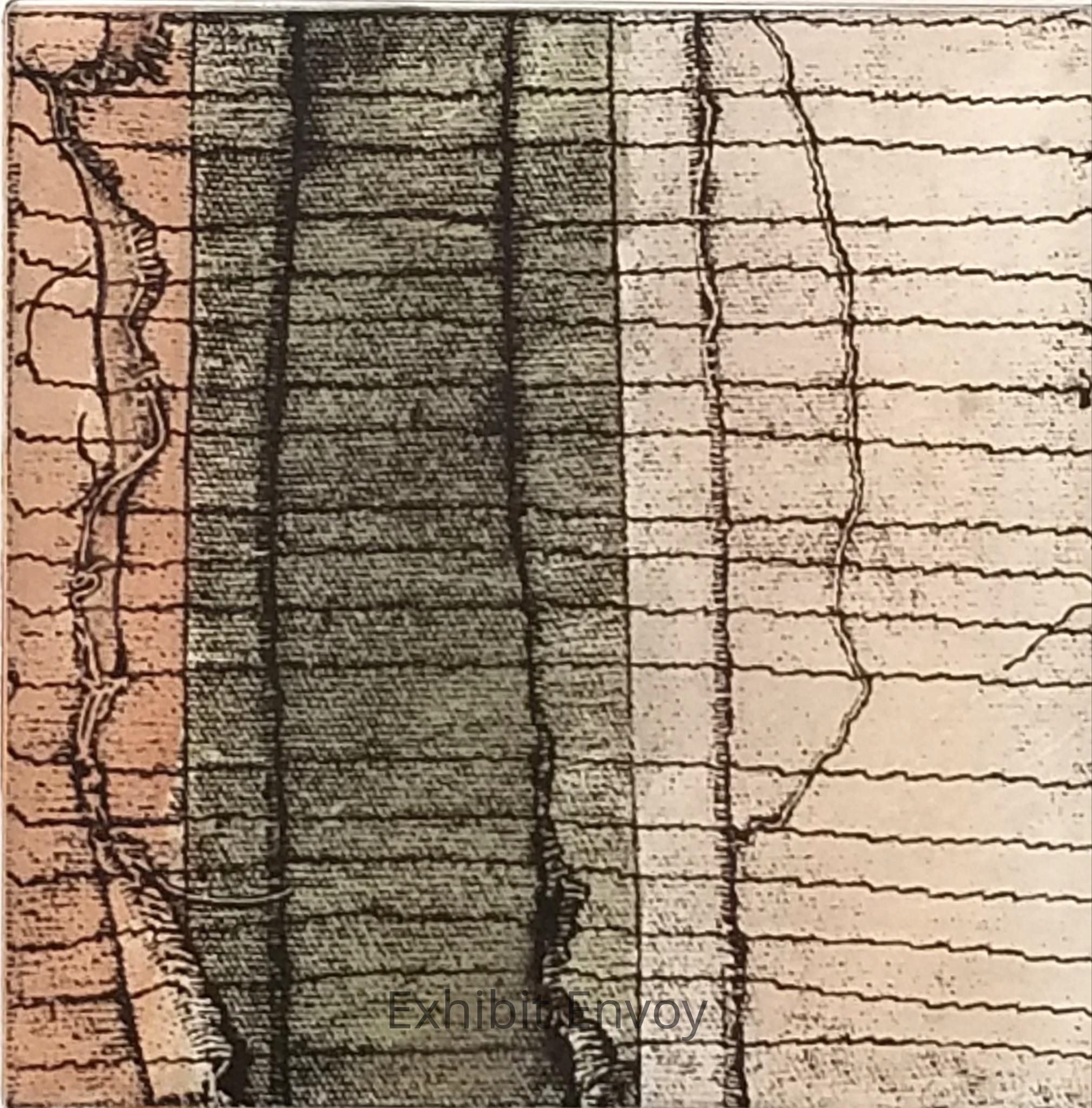 The image was produced by first sewing fabric pieces together, then gluing them onto cardboard. The collage was then scanned and enhanced using photoshop. A black and white transparency was made, and it was used to expose a photopolymer plate.