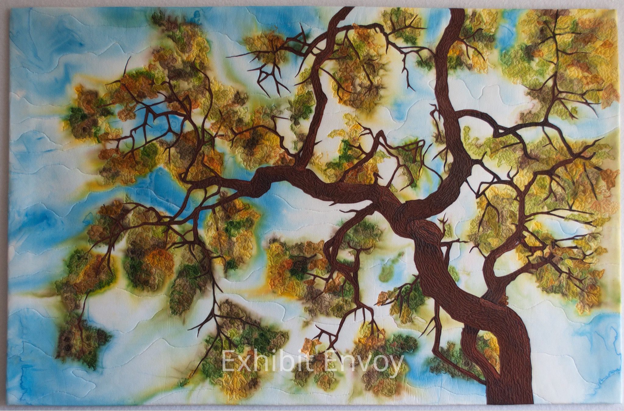 Silk background, polyester inner layer, and cotton backing. Painted polyester fiber for the tree trunk and limbs. Rayon, polyester, silk and cotton threads.