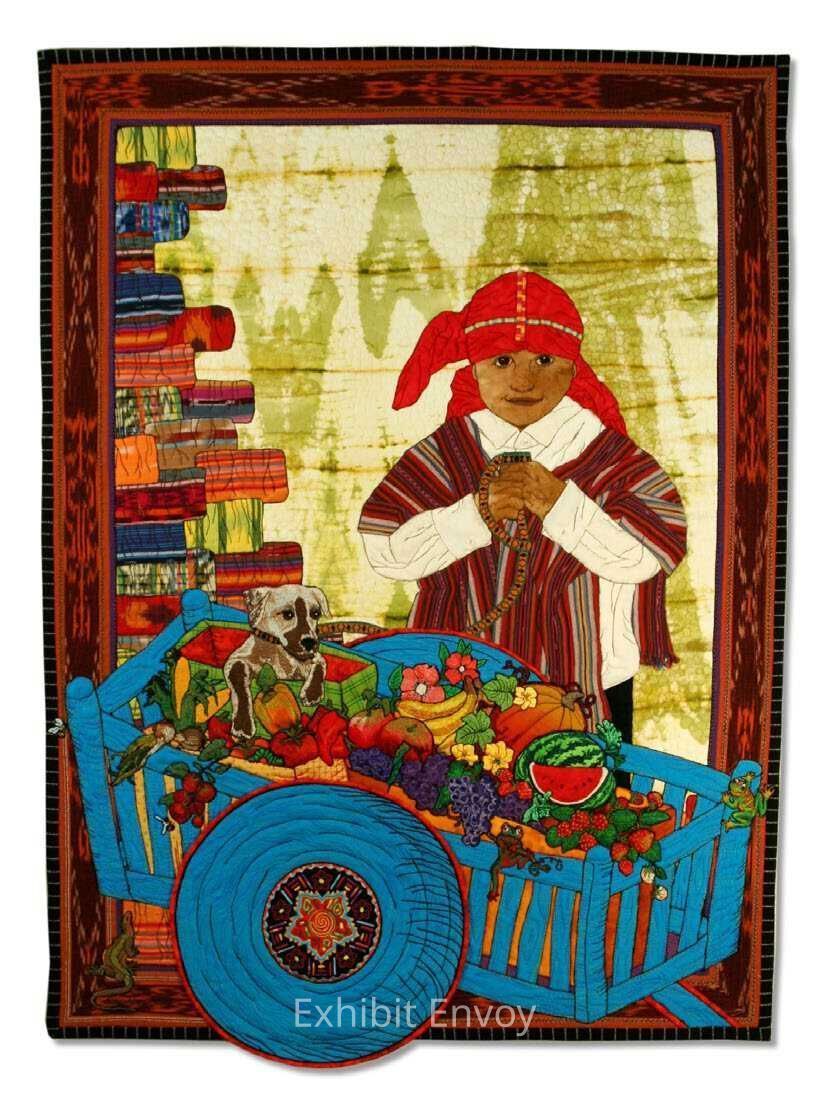 The Mexican/Spanish culture and people have greatly influenced the history and shape of California across time. The vibrant colors, tastes, traditions, music, and art can be experienced across this beautiful state. This quilt depicts a young Latino ready for the farmers market, richly celebrating our shared heritage.