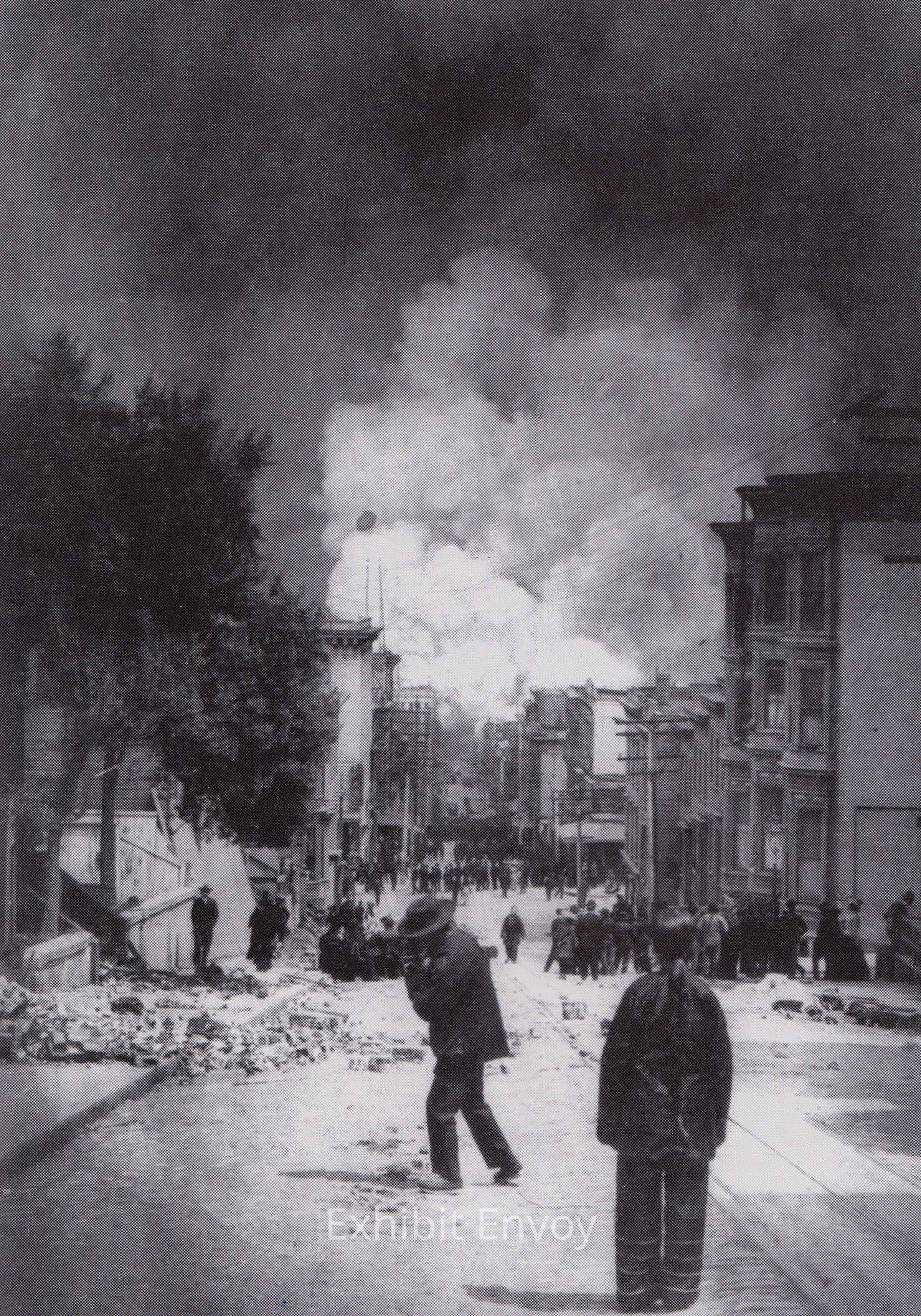 Here, residents of San Francisco survey the earthquake’s destruction of Chinatown. Clouds of smoke from the fires that followed the quake are visible in the distance.