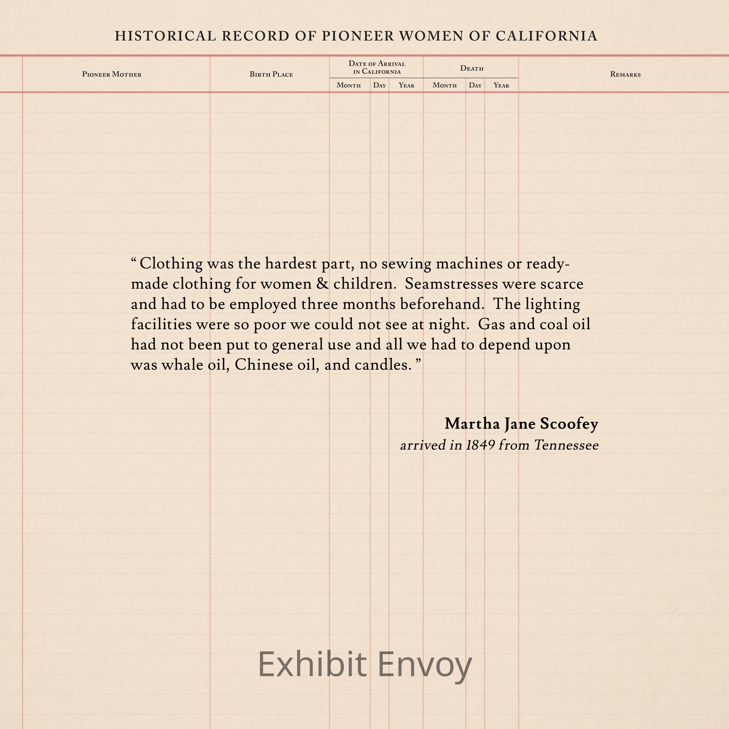 “ Clothing was the hardest part, no sewing machines or ready-made clothing for women & children. Seamstresses were scarce and had to be employed three months beforehand. The lighting facilities were so poor we could not see at night. Gas and coal oil had not been put to general use and all we had to depend upon was whale oil, Chinese oil, and candles. ”