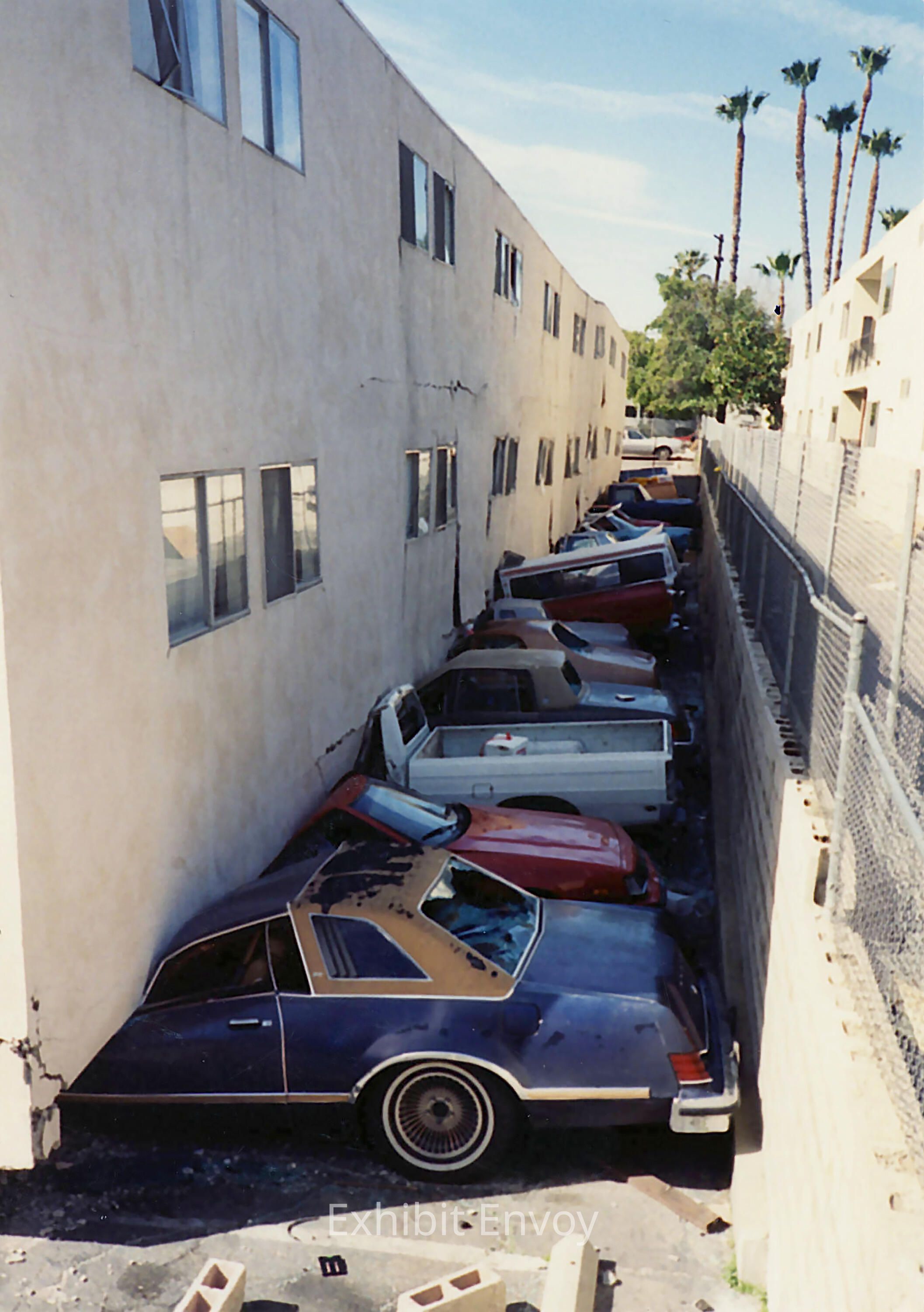 The Northridge Earthquake caused multiple buildings to collapse. This apartment building in Canoga Park collapsed on top of its understructure parking area, crushing the cars on the ground level.
