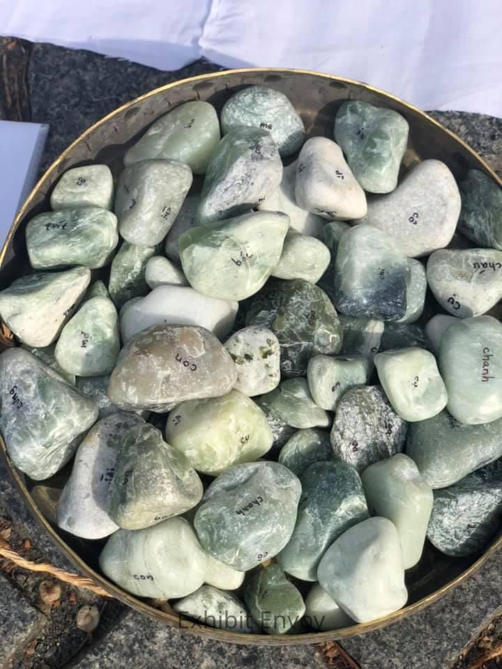 This piece consists of Việt pronouns/familial terms written on stones (con/em/chị/anh/cô/chú/bác, etc.), as a way to reflect on how Viet culture understands the terms “you” and “I” to be more complex than in the English language. Using these terms, there are no individual names on the stones, only general/anonymous pronouns – but at the same time, these pronouns/familial terms are intimate and endearing. Included are some recently coined gender non-binary pronouns such as chanh (chị + anh) that the queer Việt community uses. We asked visitors passing by to place a stone on the white cloth in memory of someone/something, as a collective makeshift memorial (similar to Jewish tradition of placing stones on a grave). The familial terms on the stones were meant to insist upon the humanity of Vietnamese people, to counteract the dehumanization of Vietnamese bodies that has occurred in the ways that America has remembered (and forgotten) the war.