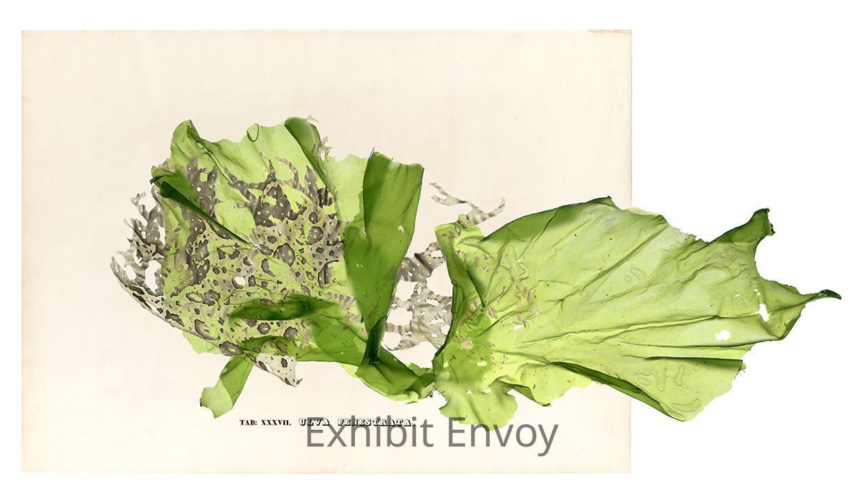 Ulva spp. with Ulva fenestrata, now Ulva lactuca, or sea lettuce, incorporating an illustration by Alexander Postels (1840). Ulva is spectacularly green, and the signature marine algae in the Chlorophyta (green) division.
