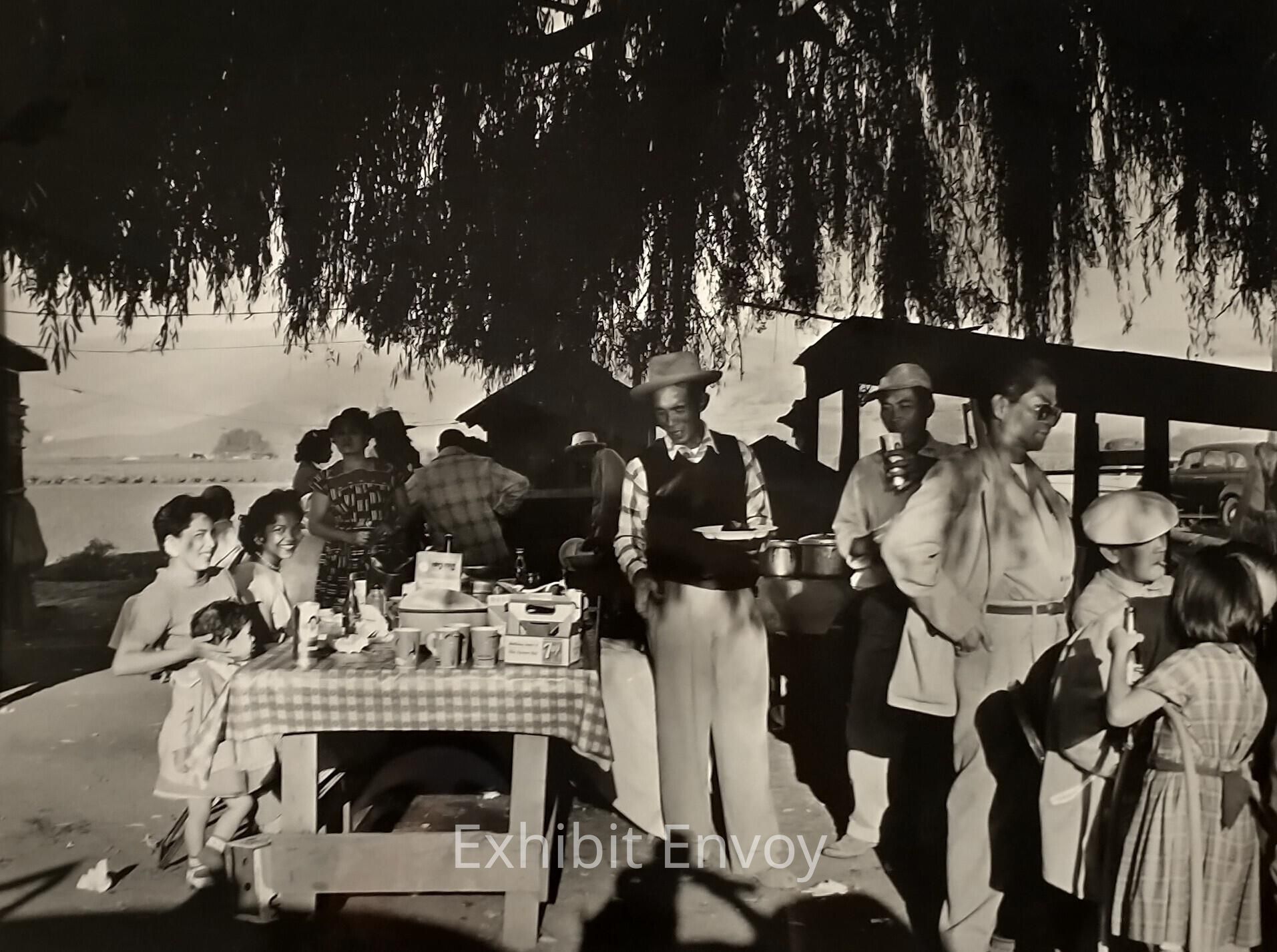 Filipino families and friends from the city often visited their "Manongs" and "Uncles" in the countryside on weekends. Ricardo Alvarado took this photograph during a visit to his eldest brother, Cirilo, a Manong migrant farmworker. During visits, the families feasted, played cards, and caught up on each other's news.