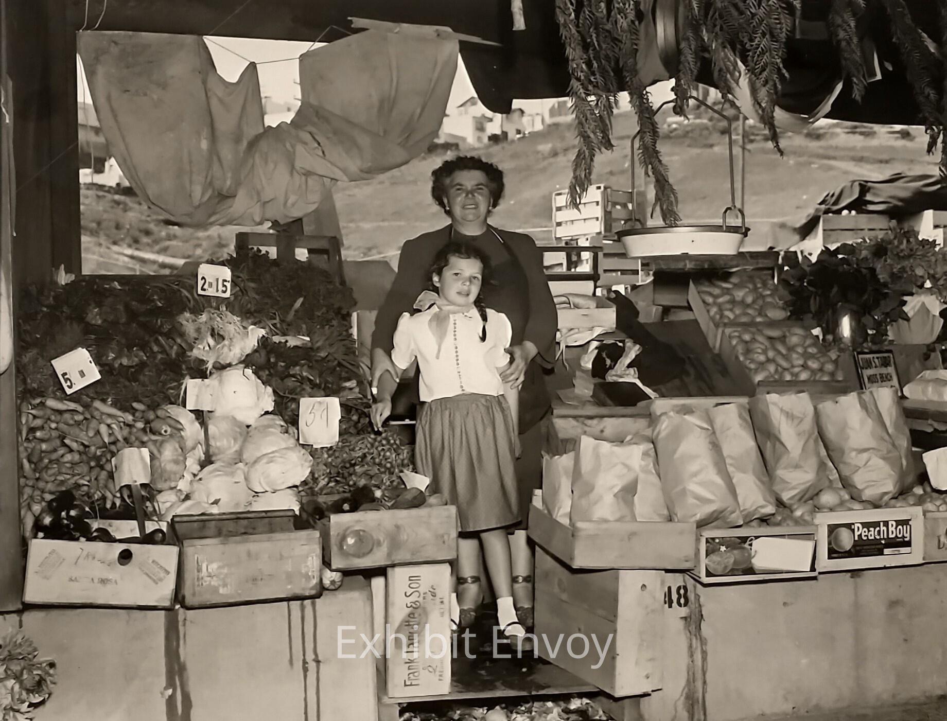 The first Farmers Market in San Francisco stands in its location off Highway 280 South. Behind the seller's stall, the lower Bernal Heights district is visible.
