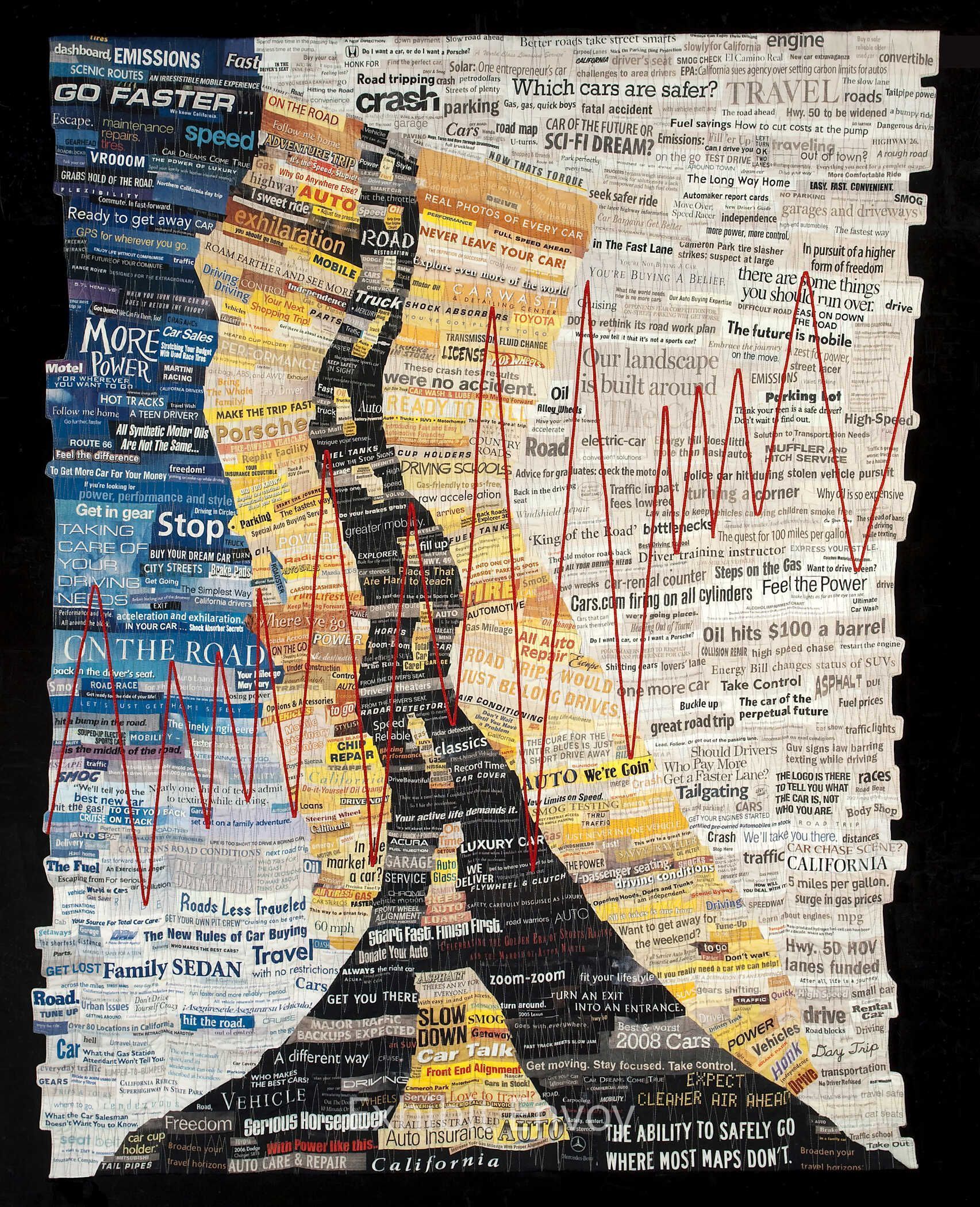 “Fault Line” uses words and phrases cut out from magazines and newspapers to highlight the interplay between form and message. It explores the car culture in California, emphasizing how the modern state was built around the car. The red jagged line not only represents the geological fault lines on which California sits but also points to our state’s other divisions or fault lines: north and south, urban and rural, documented and undocumented workers, etc.