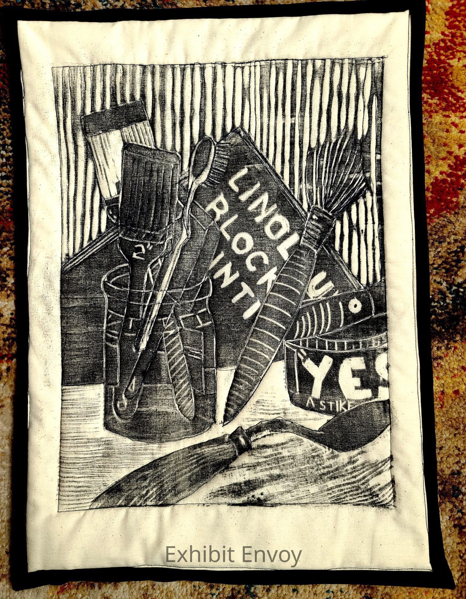 Wood plate, cutting tools, fabric, black ink, etching press, sewing machine for quilting and batting.