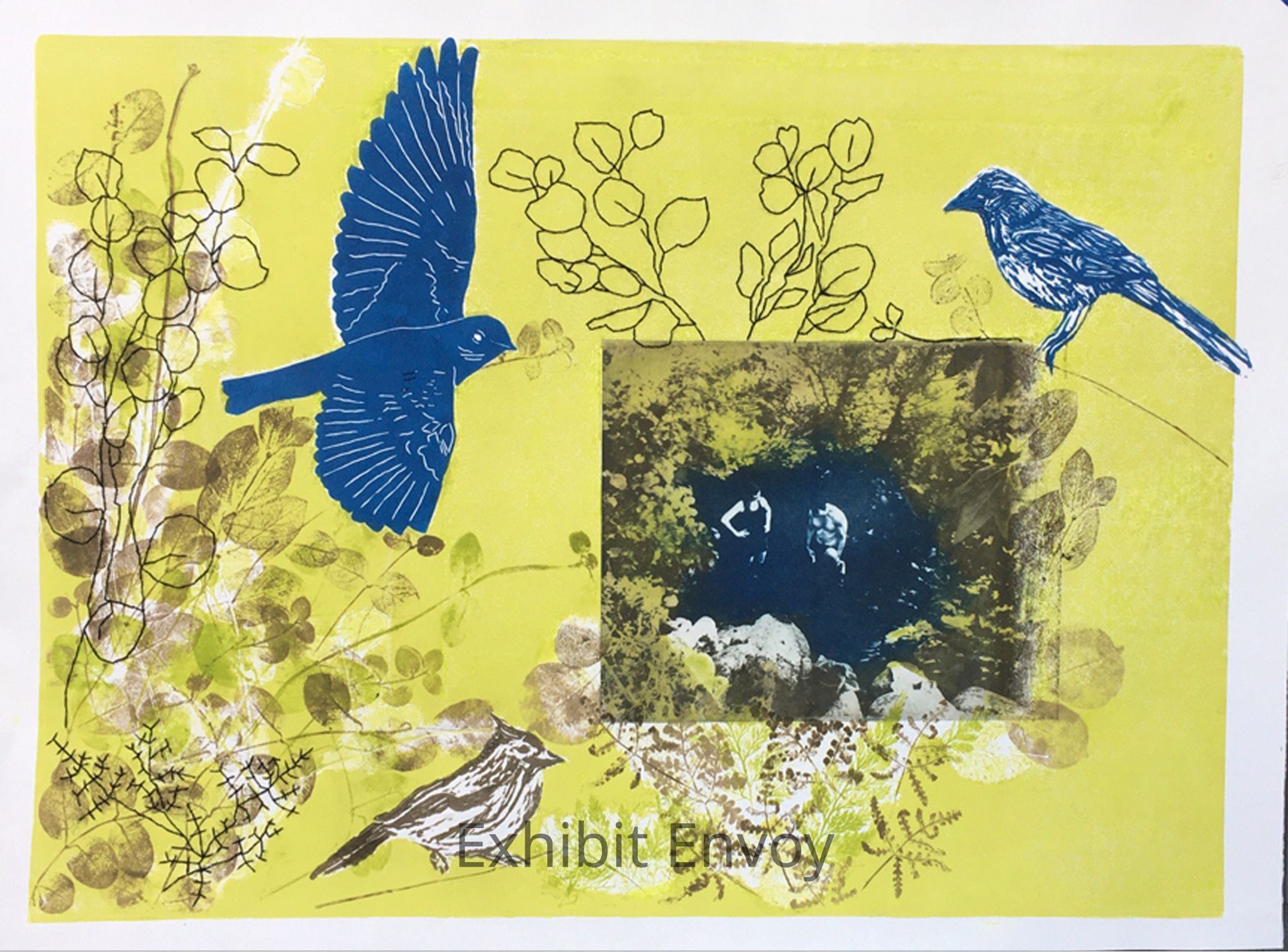 Forest Refuge incorporates several printmaking techniques. The process began with the photopolymer etching plate and linoleum blocks of birds individually cut. This was followed by a monoprint layer with layers of cut and natural stencils. lastly embroidery was applied by hand.