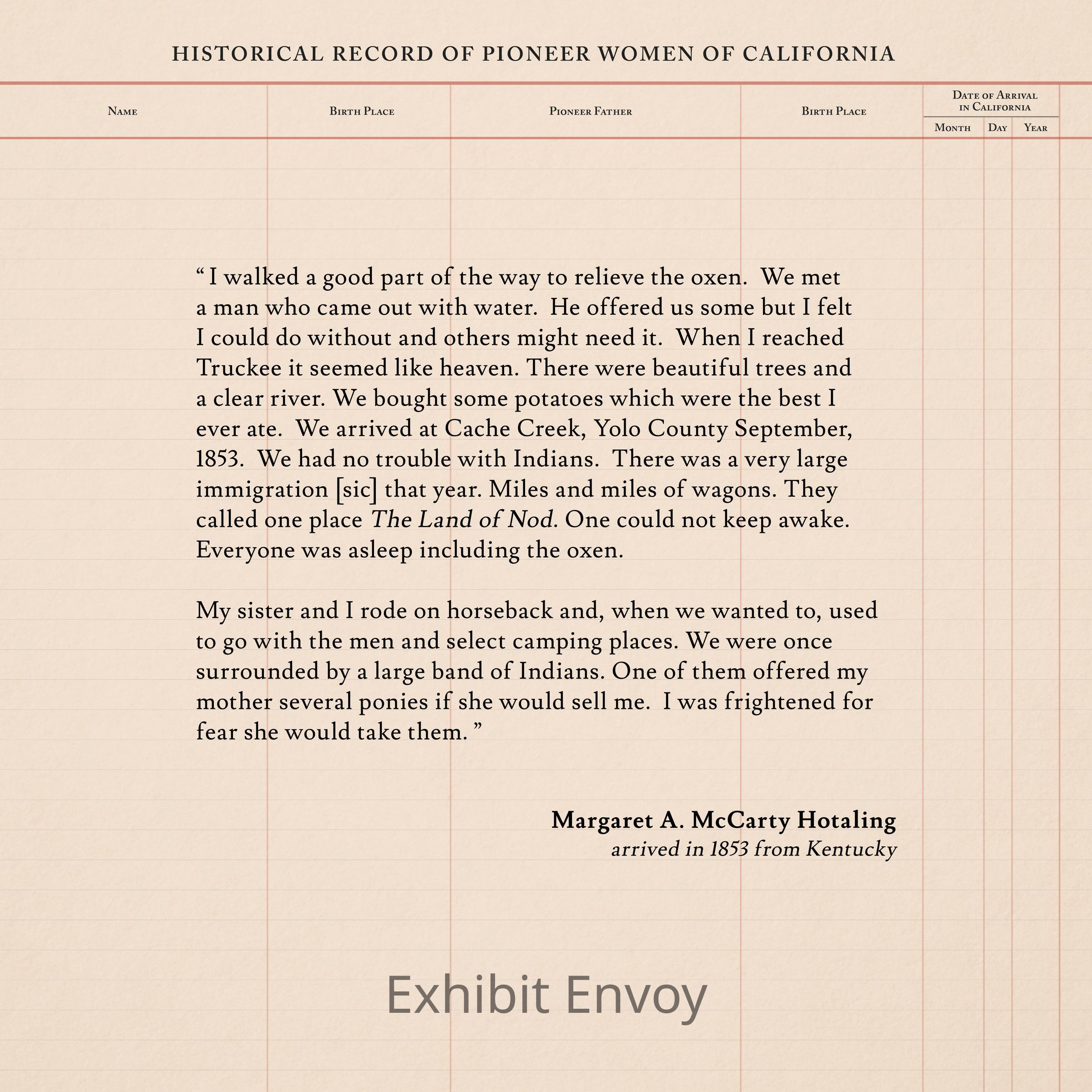 “ I walked a good part of the way to relieve the oxen. We met a man who came out with water. He offered us some but I felt I could do without and others might need it. When I reached Truckee it seemed like heaven. There were beautiful trees and a clear river. We bought some potatoes which were the best I ever ate. We arrived at Cache Creek, Yolo County September, 1853. We had no trouble with Indians. There was a very large immigration [sic] that year. Miles and miles of wagons. They called one place The Land of Nod. One could not keep awake. Everyone was asleep including the oxen.