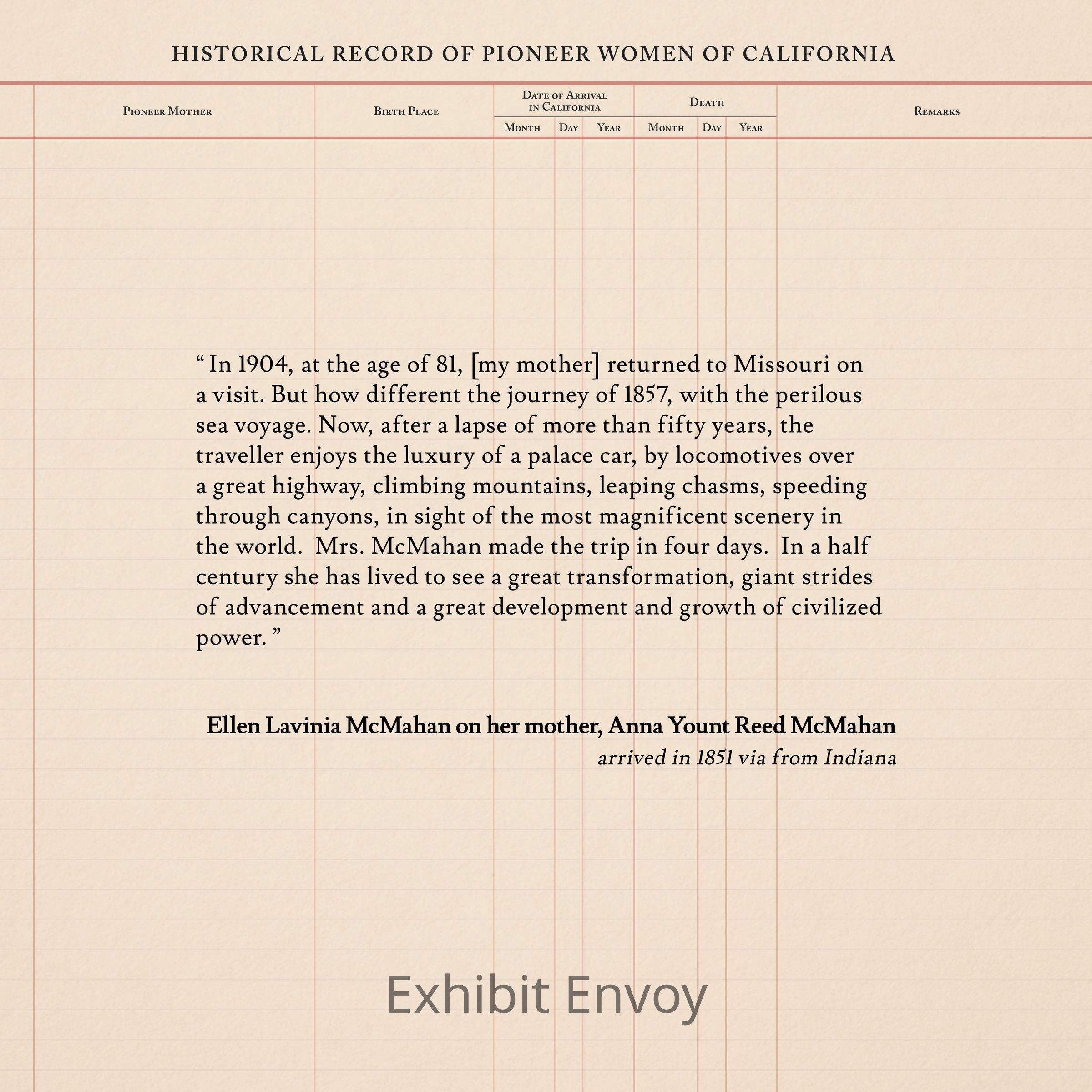 “ In 1904, at the age of 81, [my mother] returned to Missouri on a visit. But how different the journey of 1857, with the perilous sea voyage. Now, after a lapse of more than fifty years, the traveller enjoys the luxury of a palace car, by locomotives over a great highway, climbing mountains, leaping chasms, speeding through canyons, in sight of the most magnificent scenery in the world. Mrs. McMahan made the trip in four days. In a half century she has lived to see a great transformation, giant strides of advancement and a great development and growth of civilized power. ”