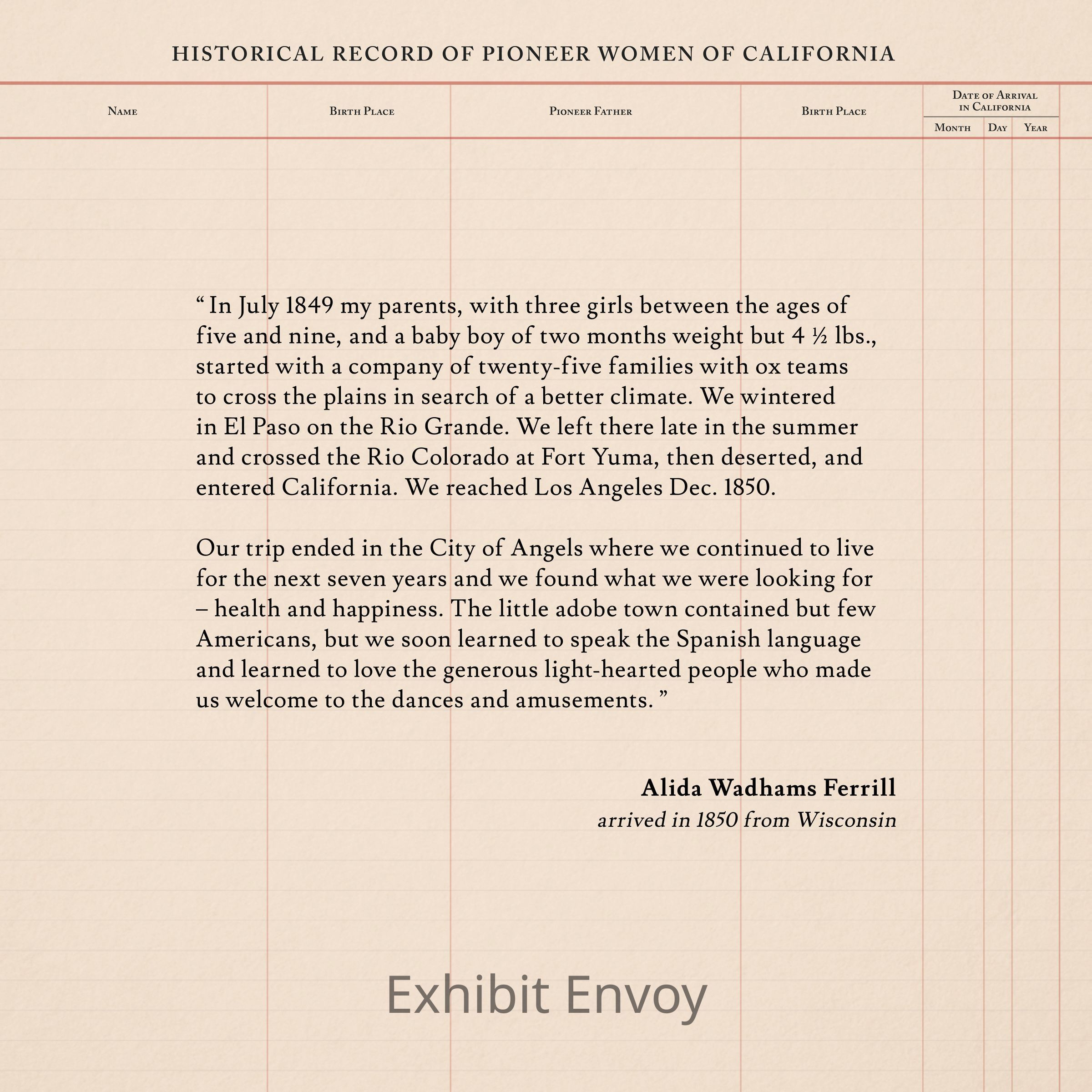 “ In July 1849 my parents, with three girls between the ages of five and nine, and a baby boy of two months weight but 4 ½ lbs., started with a company of twenty-five families with ox teams to cross the plains in search of a better climate. We wintered in El Paso on the Rio Grande. We left there late in the summer and crossed the Rio Colorado at Fort Yuma, then deserted, and entered California. We reached Los Angeles Dec. 1850.