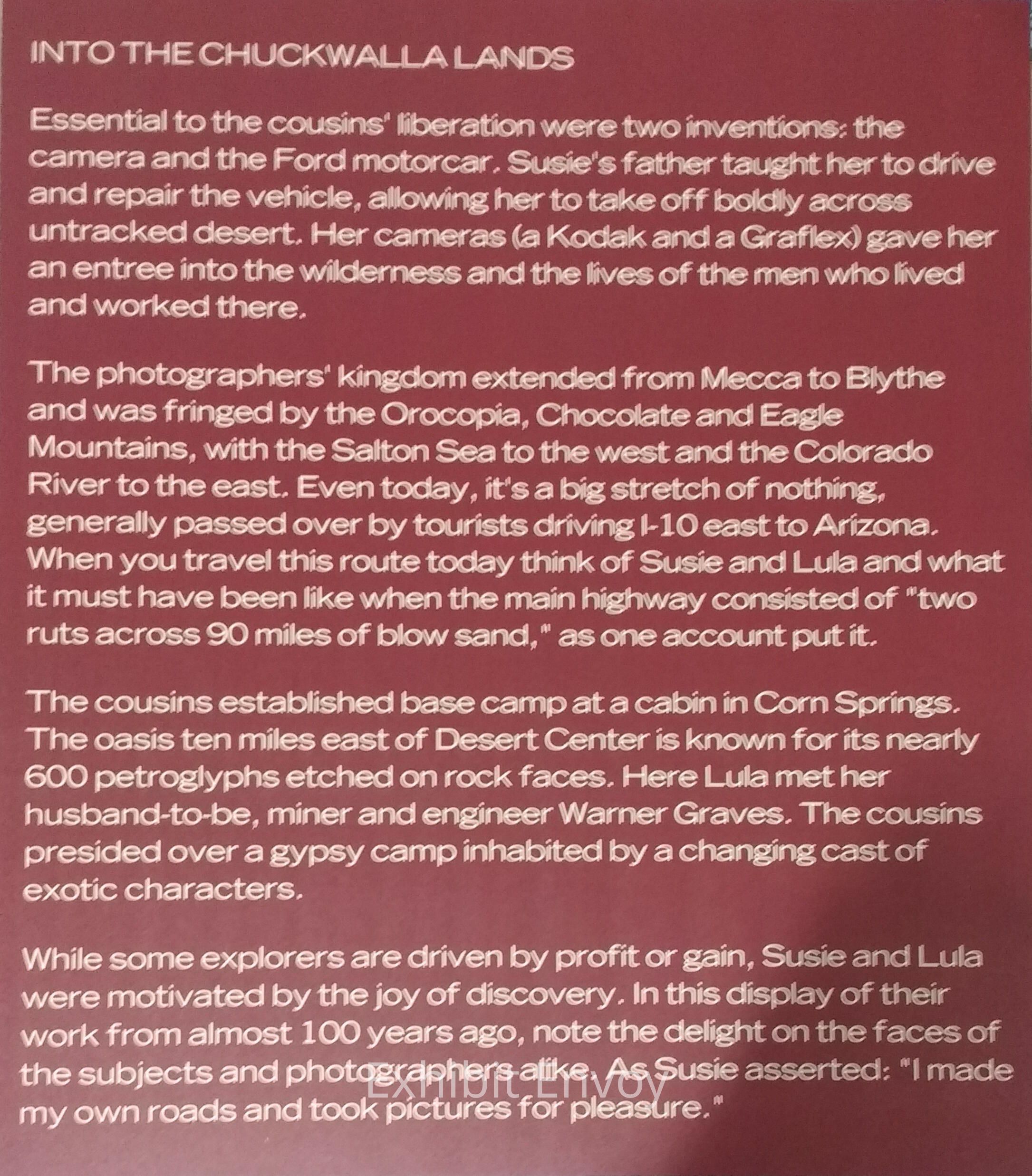 Essential to the cousins' liberation were two inventions: the camera and the Ford motorcar. Susie's father taught her to drive and repair the vehicle, allowing her to take off boldly across untracked desert. Her cameras (a Kodak and a Graflex) gave her an entree into the wilderness and the lives of the men who lived and worked there.