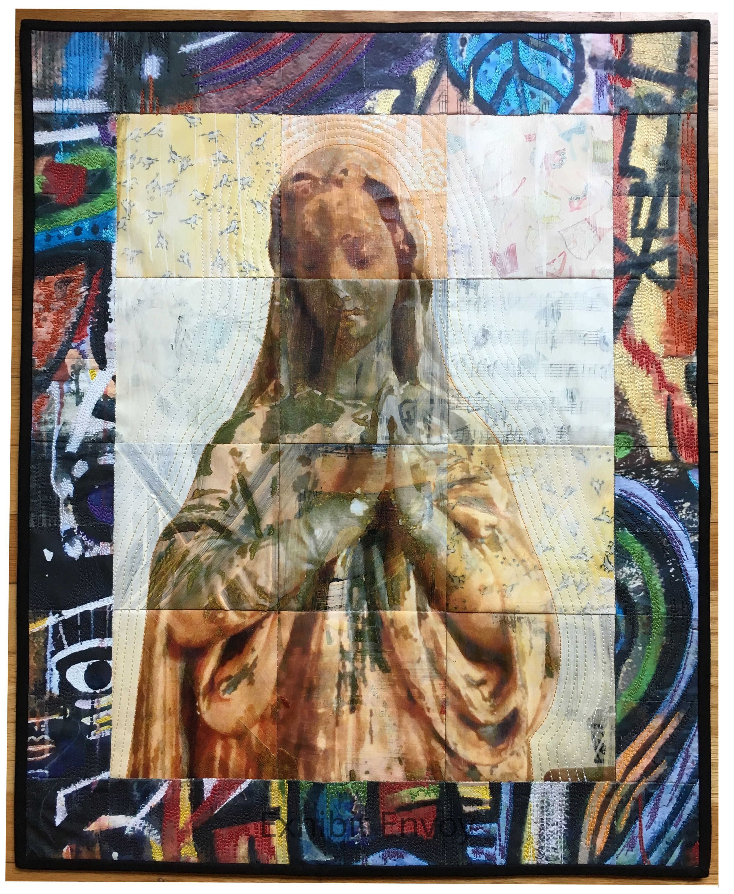 The San Luis California Madonna is a pictorial representation in fabric of California’s past and present art genres. The religious icon sits in juxtaposition to a current-day graffiti border. The piece signifies the juxtaposition of California’s past and present through photo transfer and stitch.