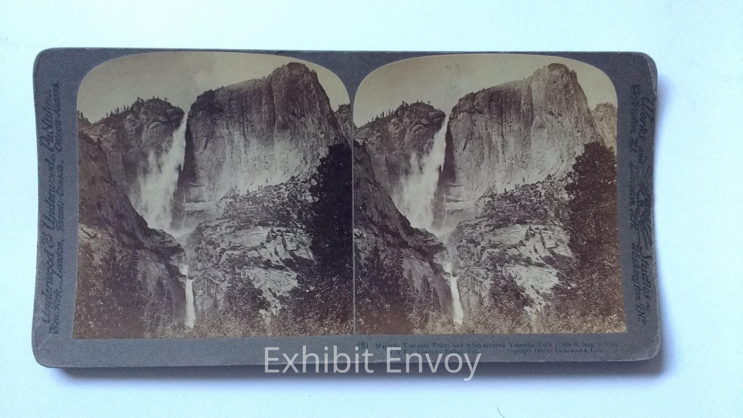 Majestic Yosemite Point, and wind-sprayed Yosemite Falls (1,600 ft. leap, looking N.N.E.), Yosemite Valley, California. Part of YP Discovery Kit
