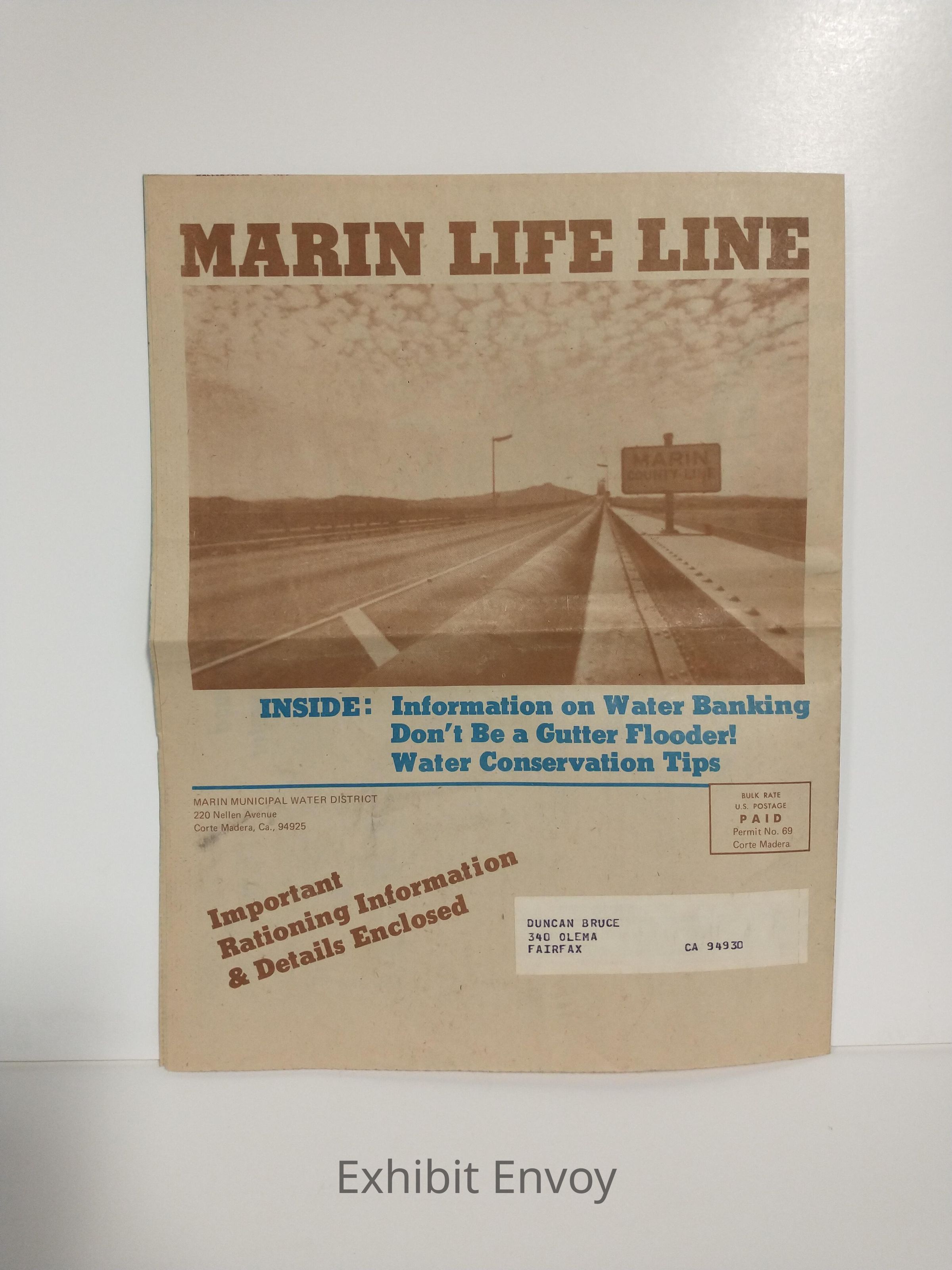 Marin Municipal Water District newsletters shared information about the emergency pipeline, groundwater sources, and reclaimed wastewater, among other topics. This newsletter highlighted rainfall statistics for 1975-1976 (22 inches) in comparison to a normal year (52 inches).