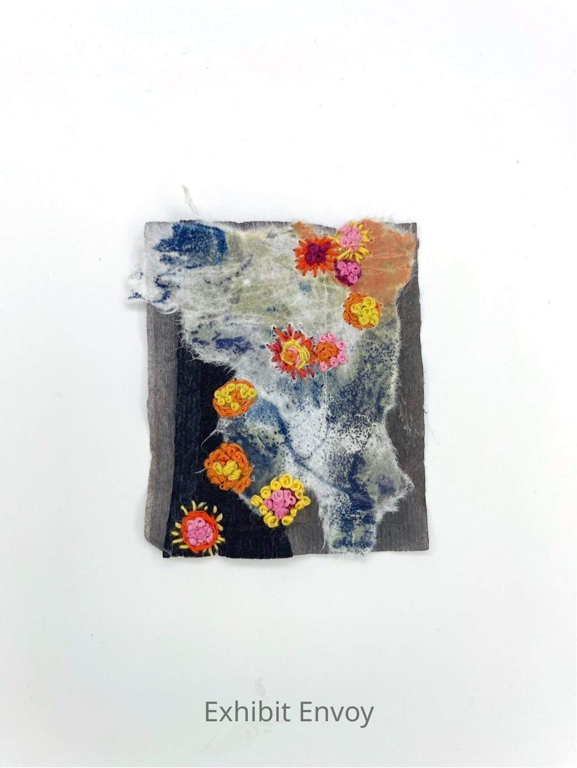 “[In my Marking Time series,] I layer and collage materials onto tiny tea bag canvases, then stitch and pierce with thread and thorns. I think of them as daily meditations, focusing on the task at hand, composing and reclaiming memory and personal history brought into my current experience. It feels reparative and healing, and acts as a psychological and emotional anchor in tumultuous times. Grounding. I find meaning through the making.