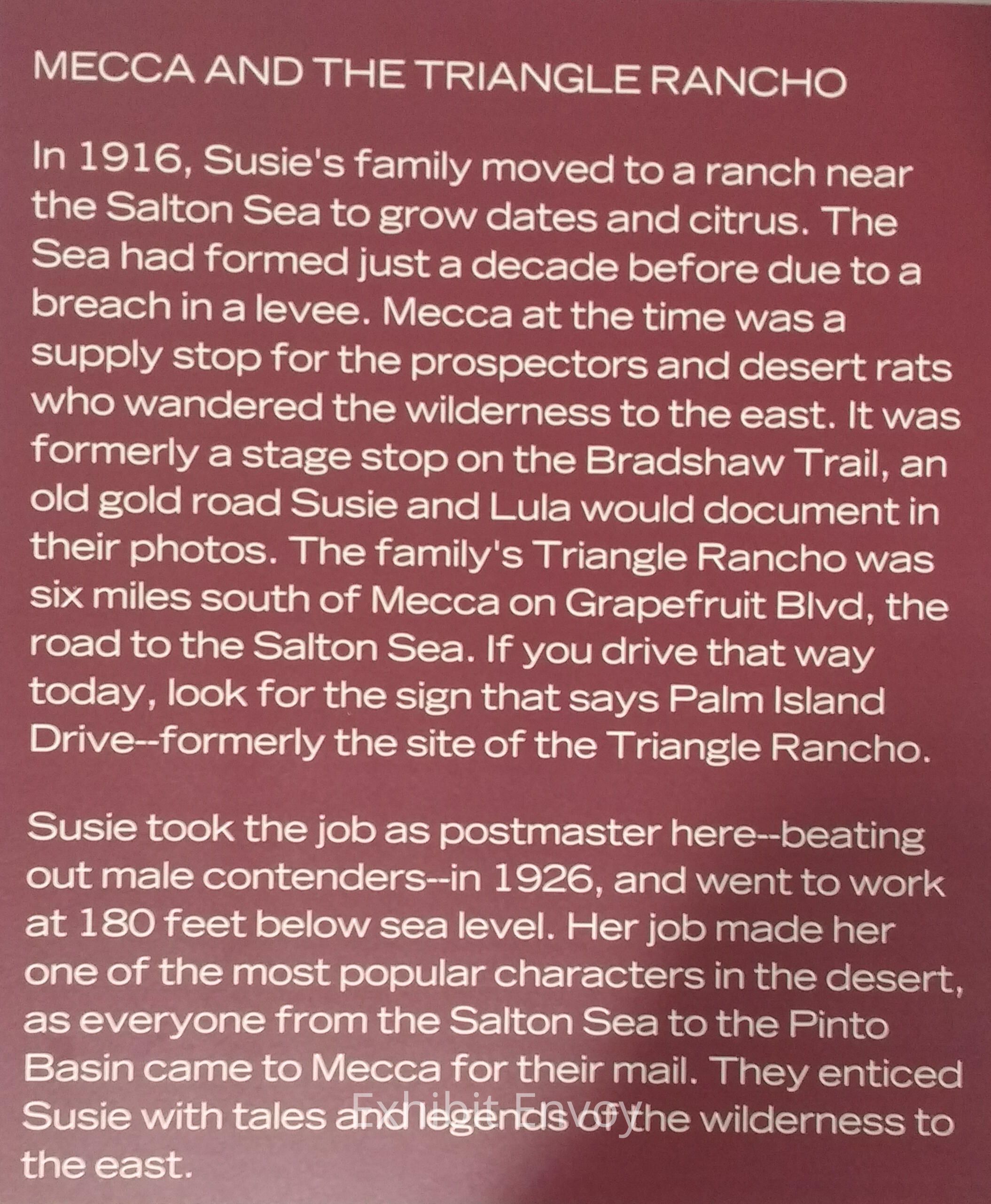 In 1916, Susie's family moved to a ranch near the Salton Sea to grow dates and citrus. The Sea had formed just a decade before due to a breach in a levee. Mecca at the time was a supply stop for the prospectors and desert rats who wandered the wilderness to the east. It was formerly a stage stop on the Bradshaw Trail, an old gold road Susie and Lula would document in their photos. The family's Triangle Rancho was six miles south of Mecca on Grapefruit Blvd, the road to the Salton Sea. If you drive that way today, look for the sign that says Palm Island Drive--formerly the site of the Triangle Rancho.