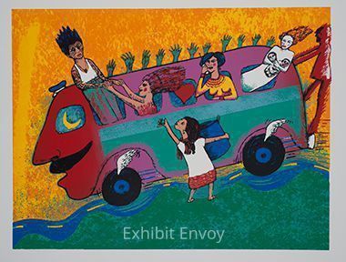 Using bright colors and folk art flavor, Araiza depicted actors in a Richard Talavera play. In this play, the audience followed the performers as they moved from the Mission Cultural Center’s theater onto a bus, deemed “the Mexican Bus.” The posters functioned as souvenirs, and the actors signed and sold the prints.